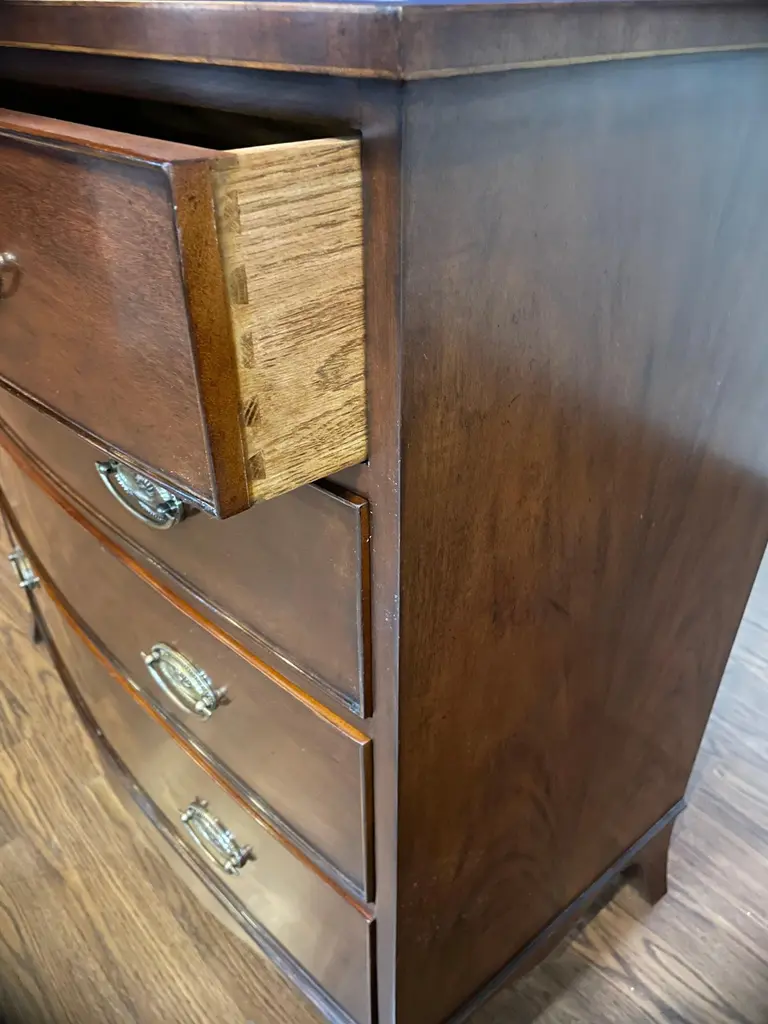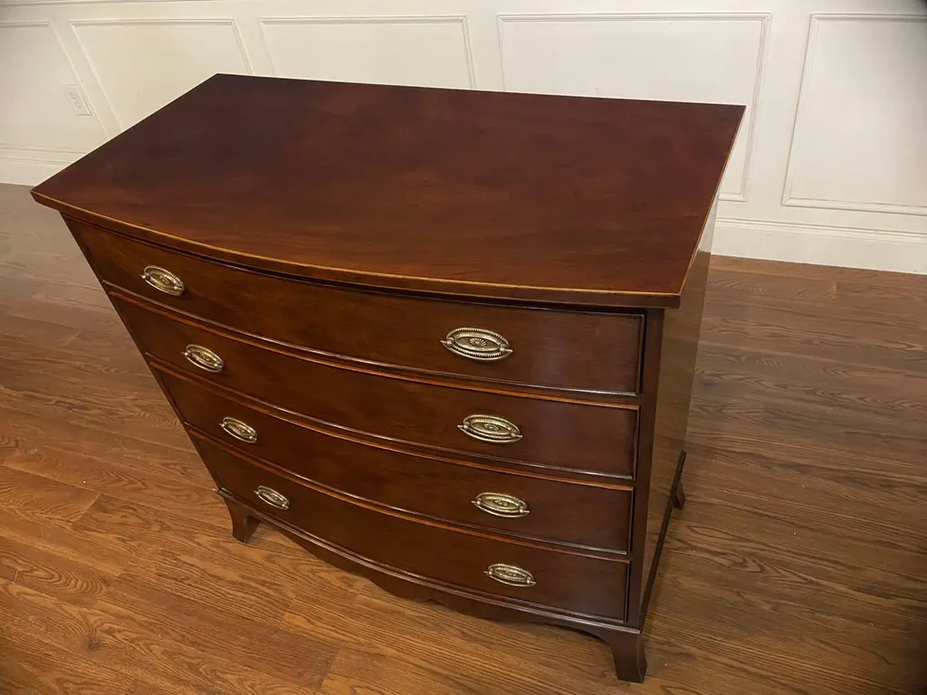 This is a classic Mahogany inlaid bow front chest by Leighton Hall. Its design was inspired by chests from the early 1800s. It features four drawers, solid brass hardware and faux key holes. The drawers are dovetailed and oak lined. It has a hand steel wool rubbed satin finish. Suggested retail price of this chest is $5,500Dimensions: W=40”; D=21”; H=38.25”Options: Optional wood: Mahogany (as shown), Yew wood, Walnut, Other Optional hardware Optional finishesNotes: Options my affect pricing Due to some raw materials shortages, some options are not currently available.