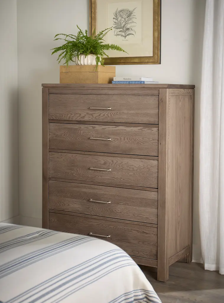 5 drawer chest features a modern reveal beneath the top and classic beaded rails; blending contemporary and traditional design.