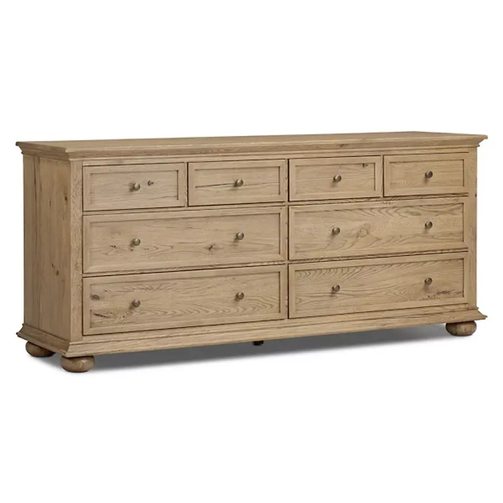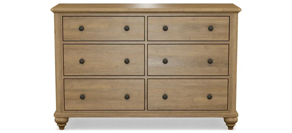 This stunning double dresser is perfect for adding style and functionality to your bedroom. With its transitional design and Modern Khaki finish, it brings a timeless touch to your space. The dresser features seven drawers, including three small upper drawers and four larger lower drawers, all with full extension slides for easy access to your belongings. The pewter hardware adds a sleek and sophisticated finish to the overall design. The drawers are constructed with dovetail joinery, ensuring long-lasting strength and durability. With its classic design and ample storage space, this double dresser is perfect for keeping your bedroom organized and clutter-free.