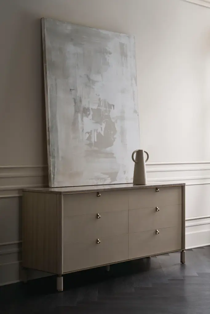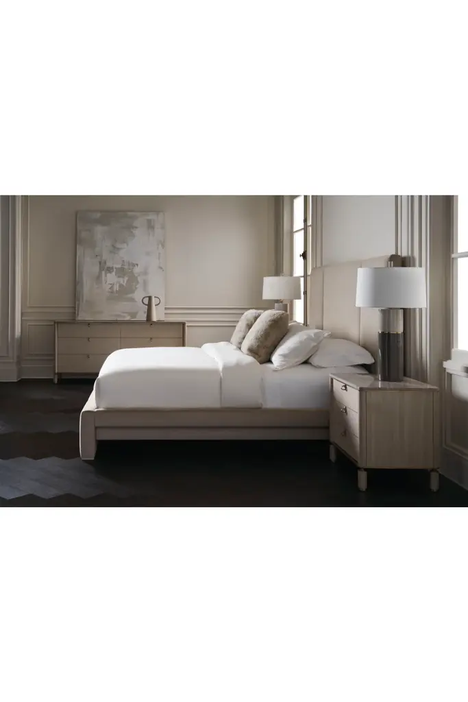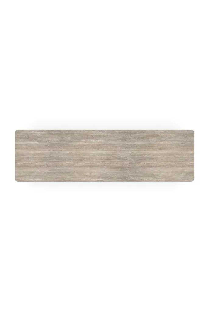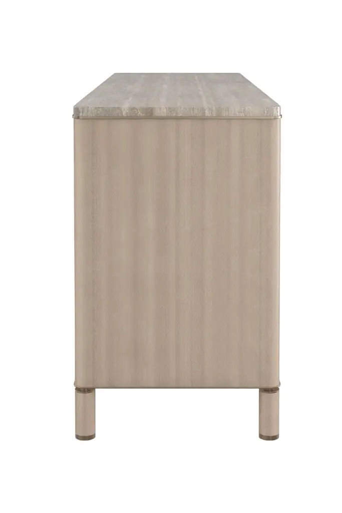 Light tones and organic textures in perfect balance exude a refined modern elegance. Soft-to-touch, vinyl wrapped drawers are complemented by Silver Platano wood veneers and a polished travertine stone top. Metal accents and a base in Lucent Bronze add warmth and subtle contrast to its calming, clean-lined form.
