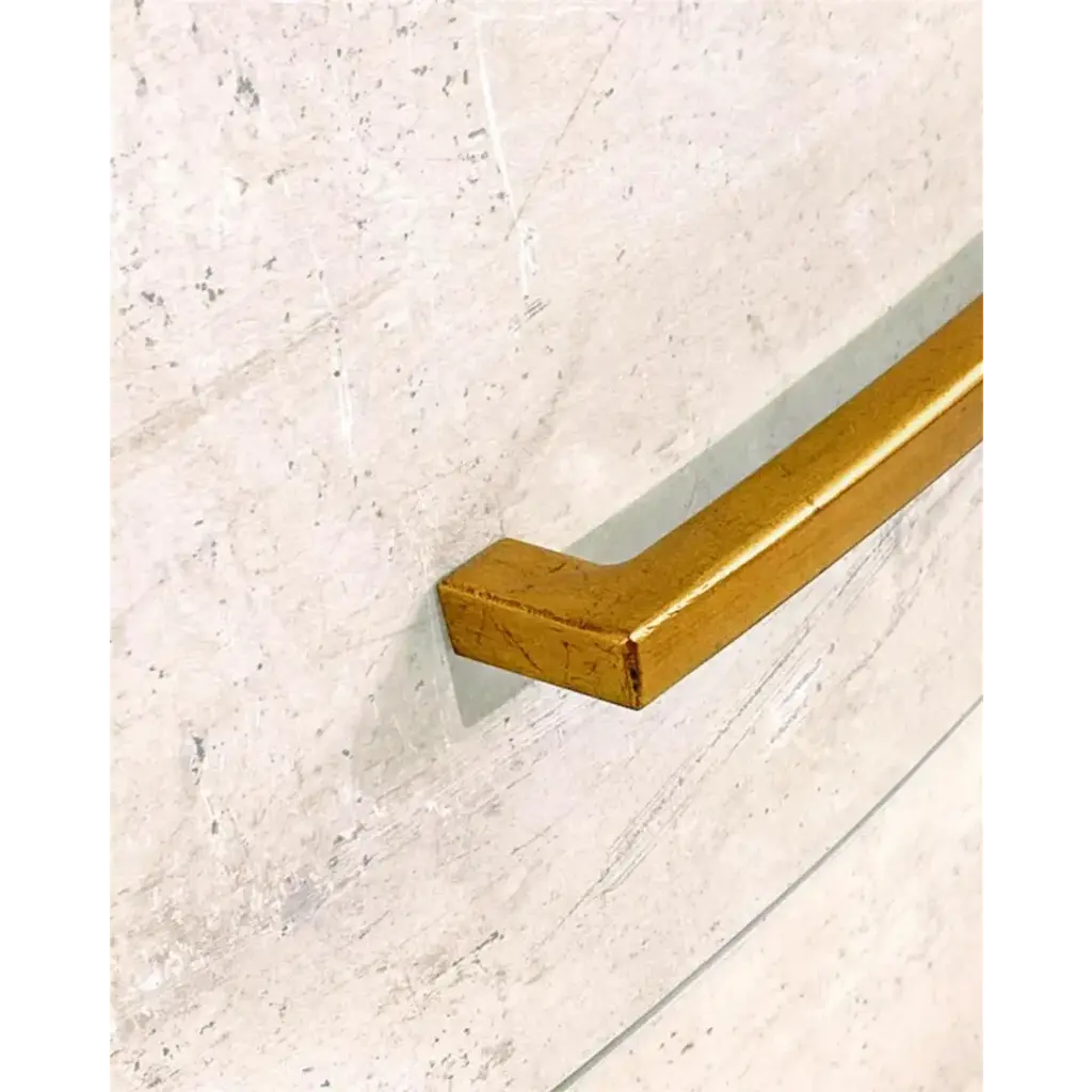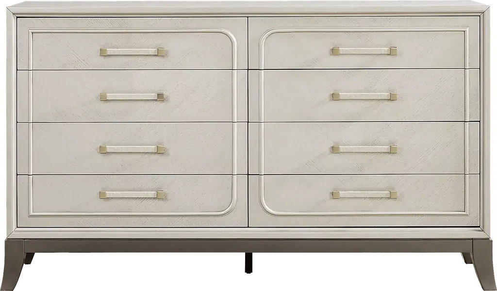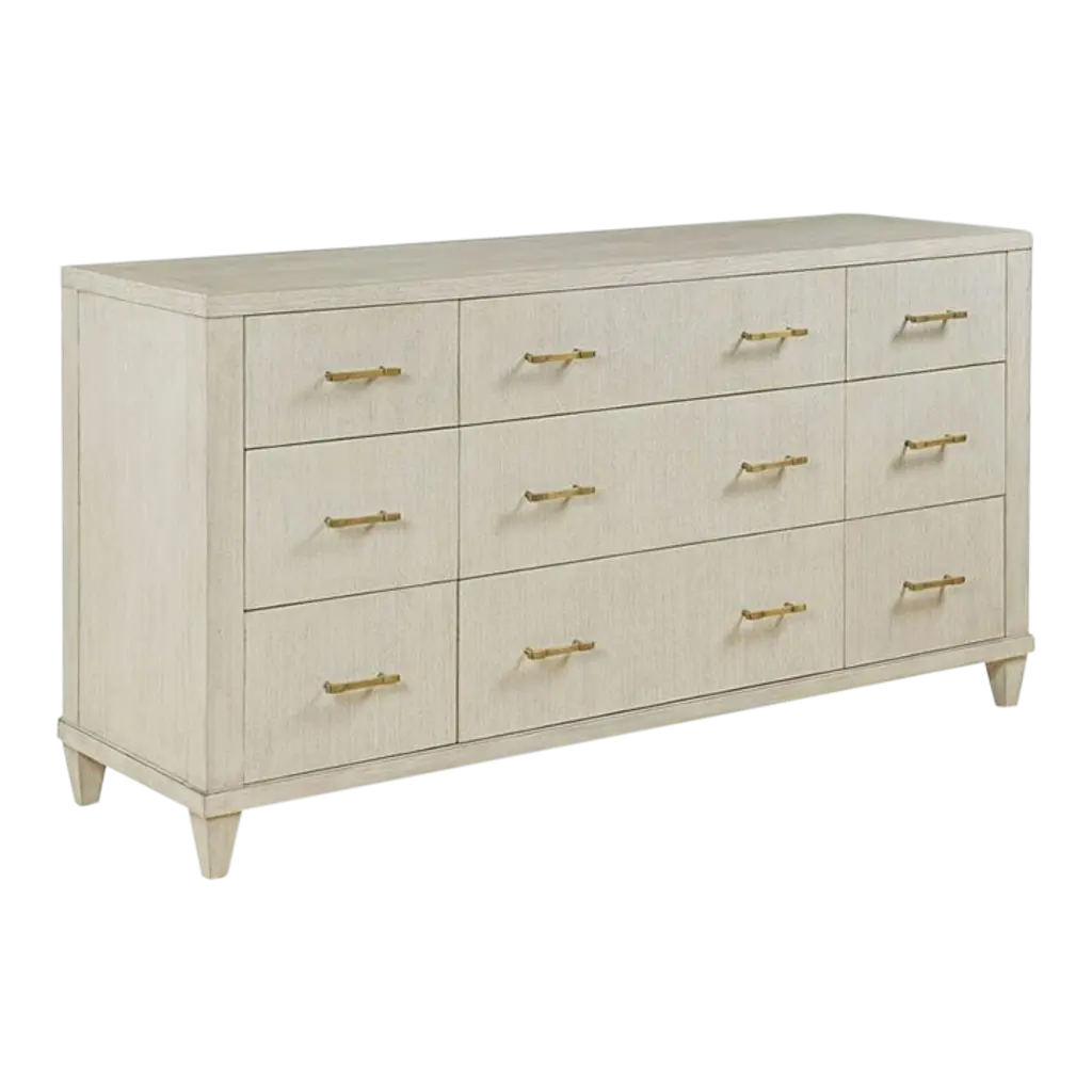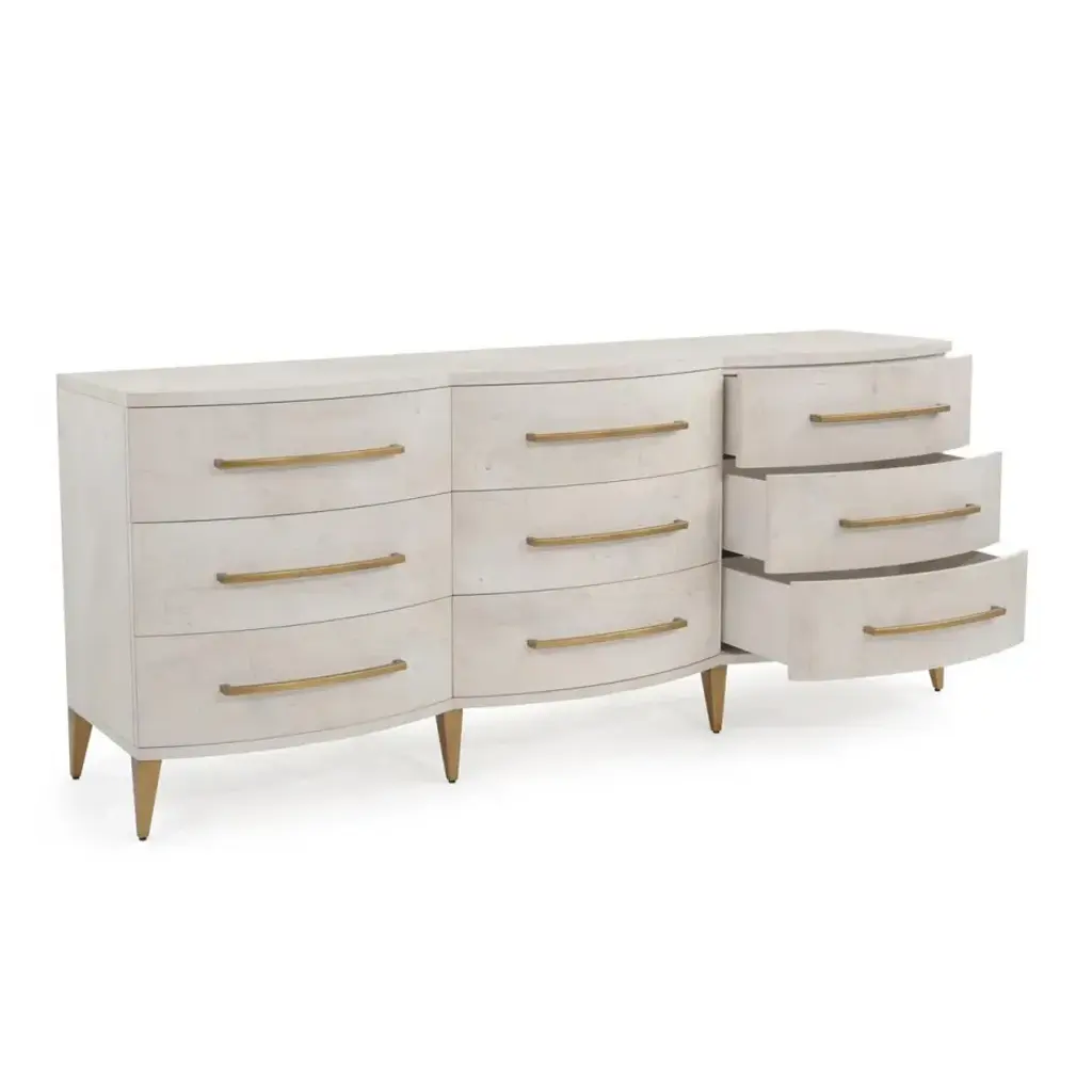 Fully encased in tiza gesso, this chest replicates elegant, curved fronts for each set of three drawers. This nine-drawer chest features soft-closing drawers with elongated, curved handles in antique gold.