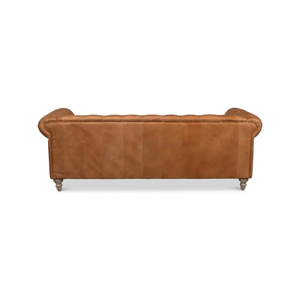 Crafted from premium top-grain leather, this sofa boasts a rich caramel hue that invites warmth into any living space. The intricate button-tufted detailing on the backrest provides a touch of aristocratic flair, while the plush cushion seat offers a cozy nook for your daily unwinding.Sturdy and graceful, the sofa's turned wooden legs add a durable foundation with a dash of antique finesse. Exquisite brass nailhead trim lines the silhouette, enhancing its grandeur.Dimensions: 85" W x 33" D x 30" HSeat - 64" W x 22" D x 18" HArm - 30" H
