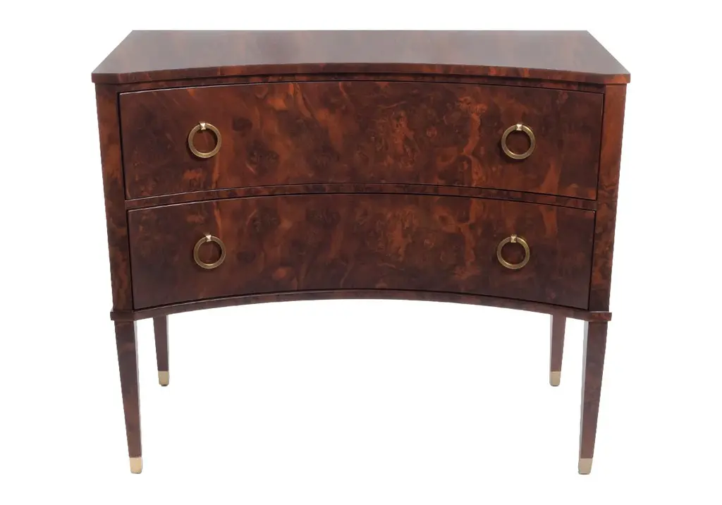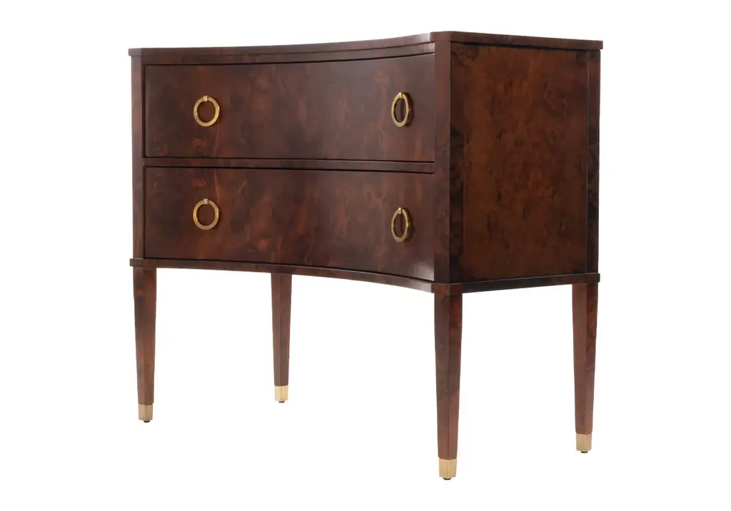 This handsome addition lends dimension with its eye-catching curved silhouette. Its natural, swirling design adds visual texture and interest, complemented by four antique brass circle pulls. Two spacious drawers provide ample storage space, creating a beautiful blend of functionality and style.