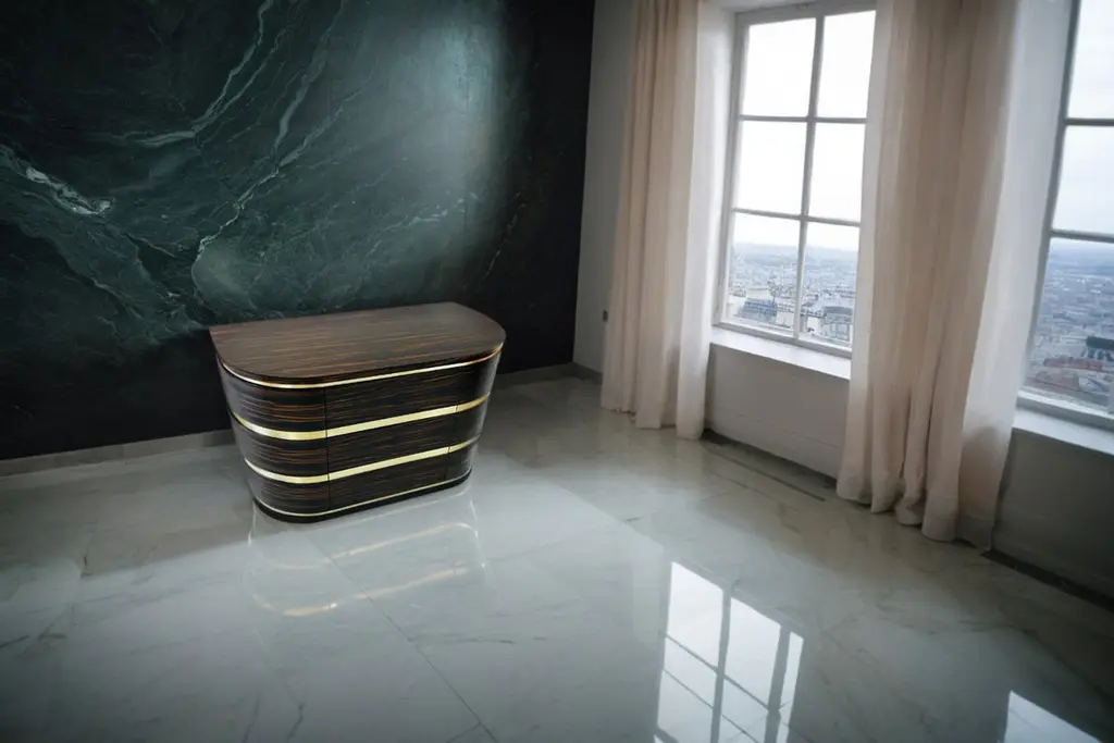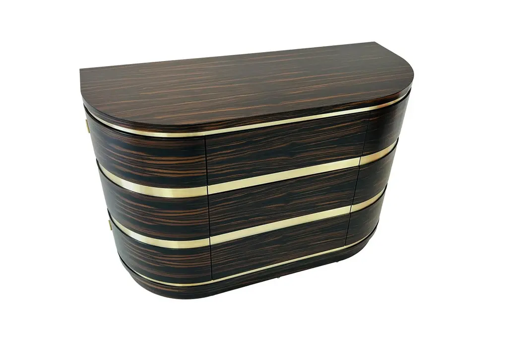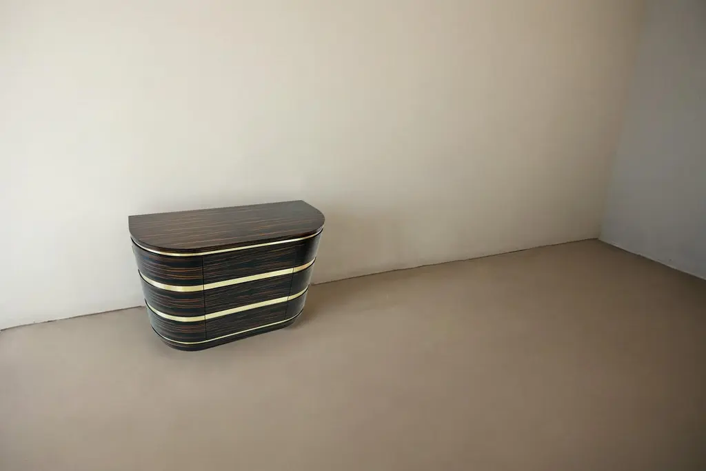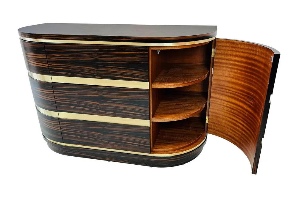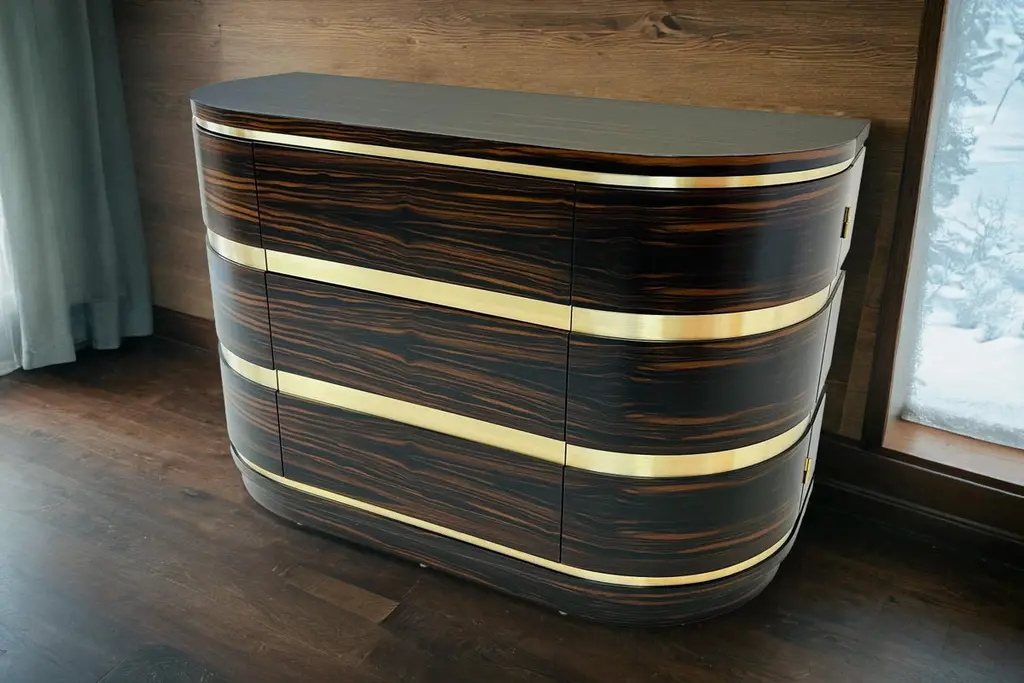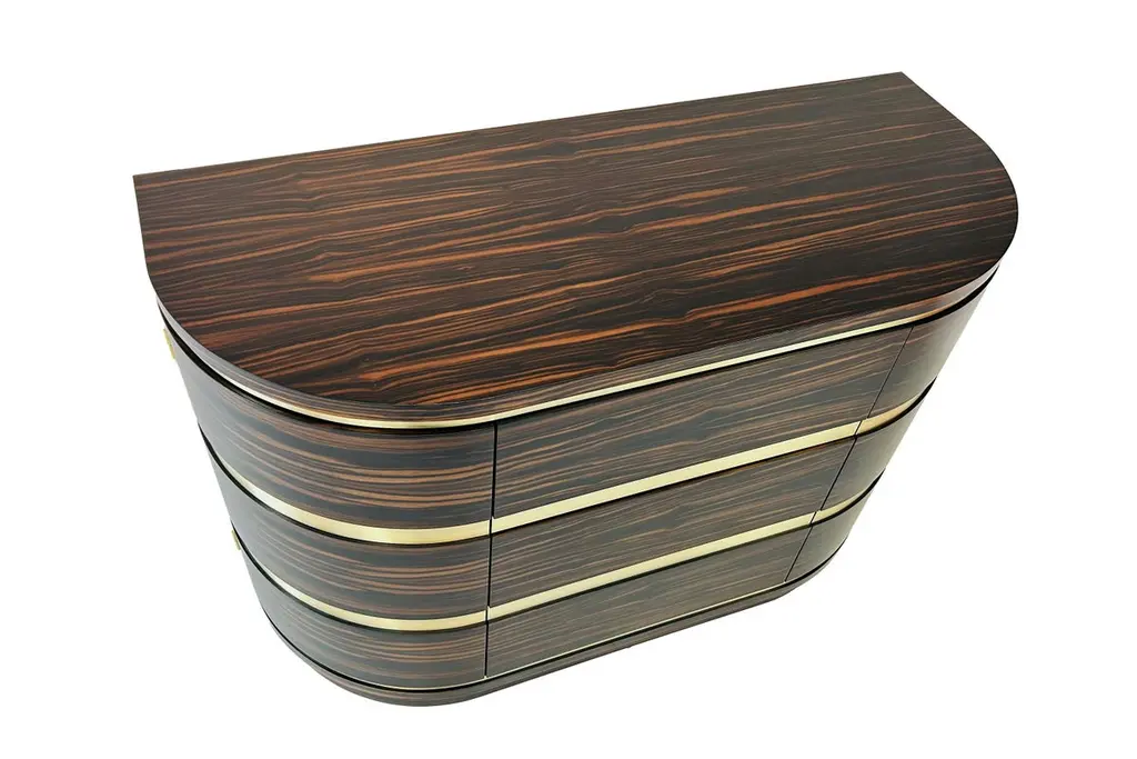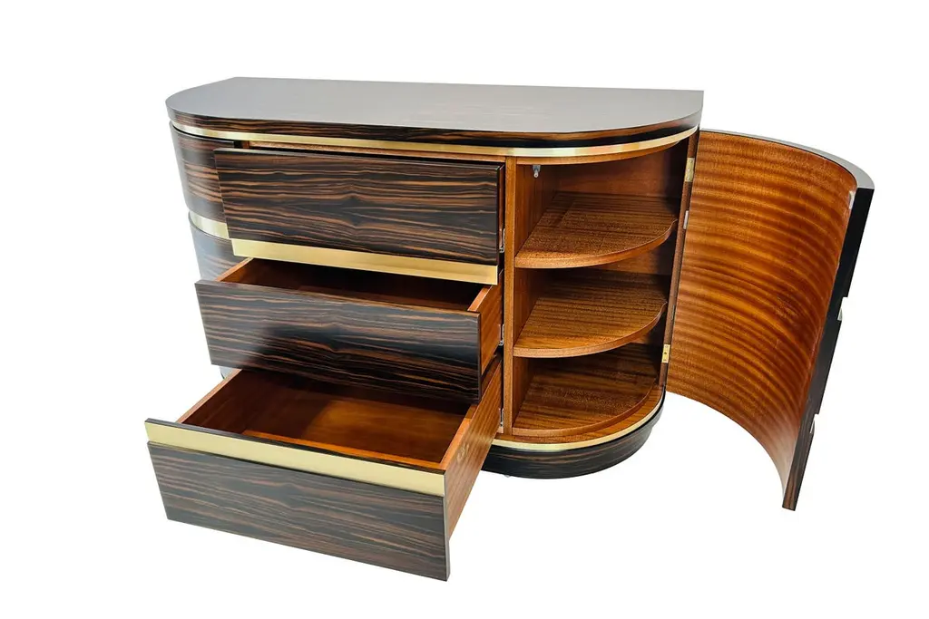 Discover the timeless beauty of Art Deco with our unique chest of drawers! Handcrafted with attention to detail, it combines sophisticated design with high-quality materials. The semi-circular sides and elegant brass fittings give it a distinctive aesthetic, while the two push-to-open doors and three drawers offer you practical storage space. The external Macassar veneer and internal mahogany veneer provide a luxurious touch that will enhance any room. Whether in the living room, bedroom or hallway, this chest of drawers is a work of art that perfectly combines functionality and elegance. Add a touch of timeless class to your home with our Art Deco chest of drawers!As with all of our furniture, you are purchasing the highest quality here. The entire piece of furniture is covered with a multi-layer structure of various varnishes and primers and has a multi-layer finish. A piece of history and craftsmanship that we were able to give the old splendor of the 1920s with a lot of love and perfection.Height: 80cmWidth: 120cmDepth: 50cmStyle: Art DecoPlace of origin: GermanyPeriod: mid-20th centuryMaterials and techniques: Macassar veneer, mahogany veneer, molded glue, high-gloss lacquer, push to open doors and drawers, brass fittings.Condition: New. Lacquered in high gloss.If you would like the sideboard in a different size, paint color or wood, please contact us!We look forward to your ideas!