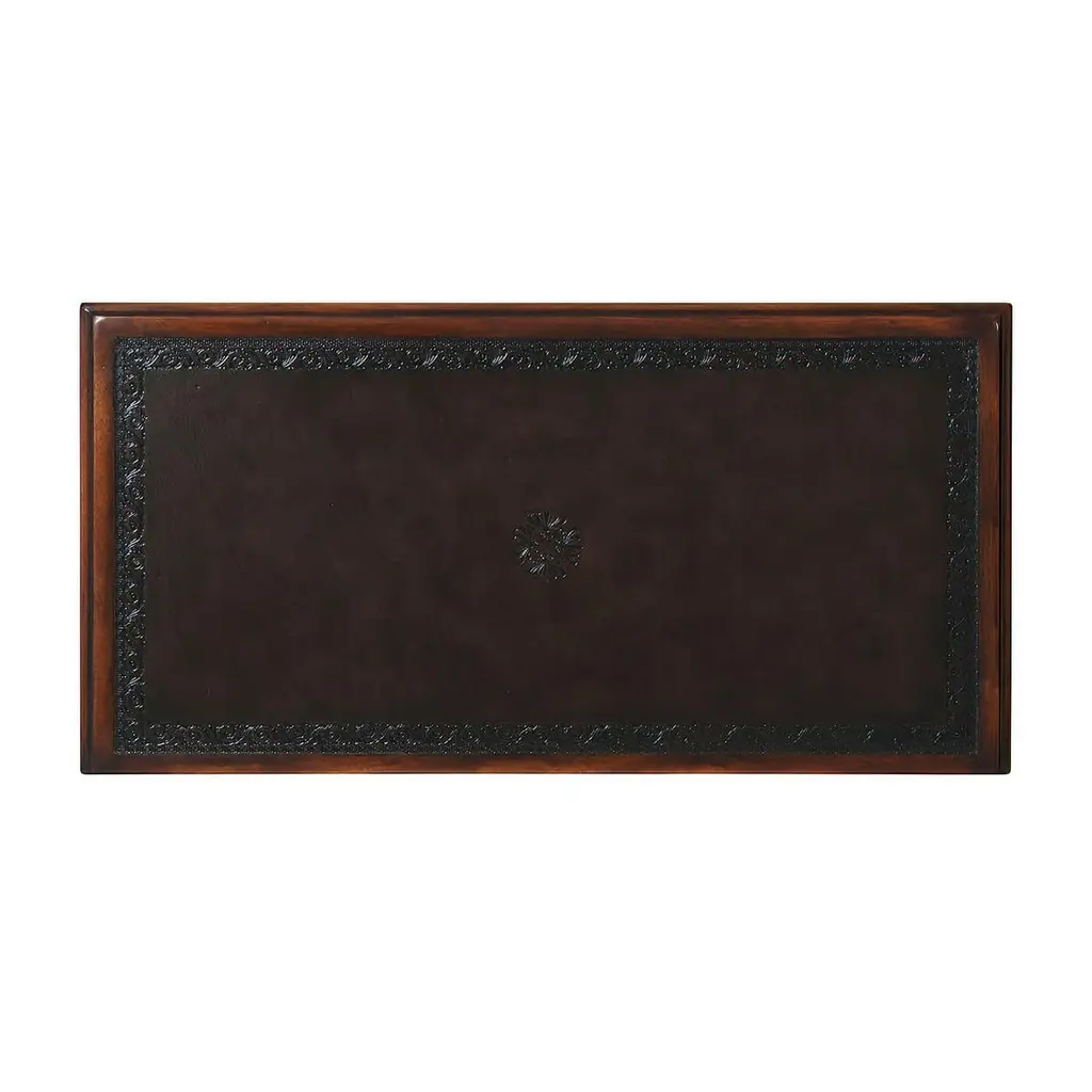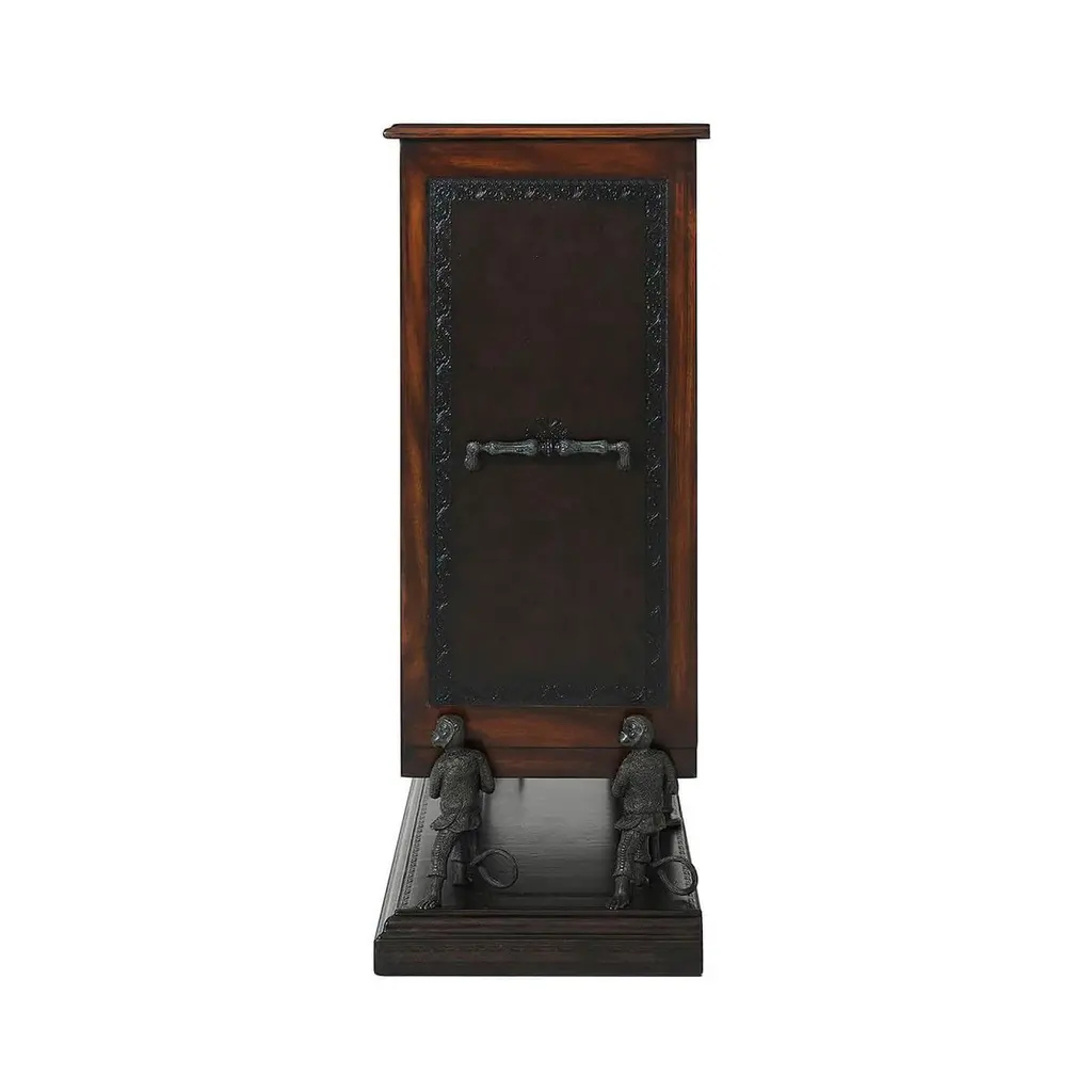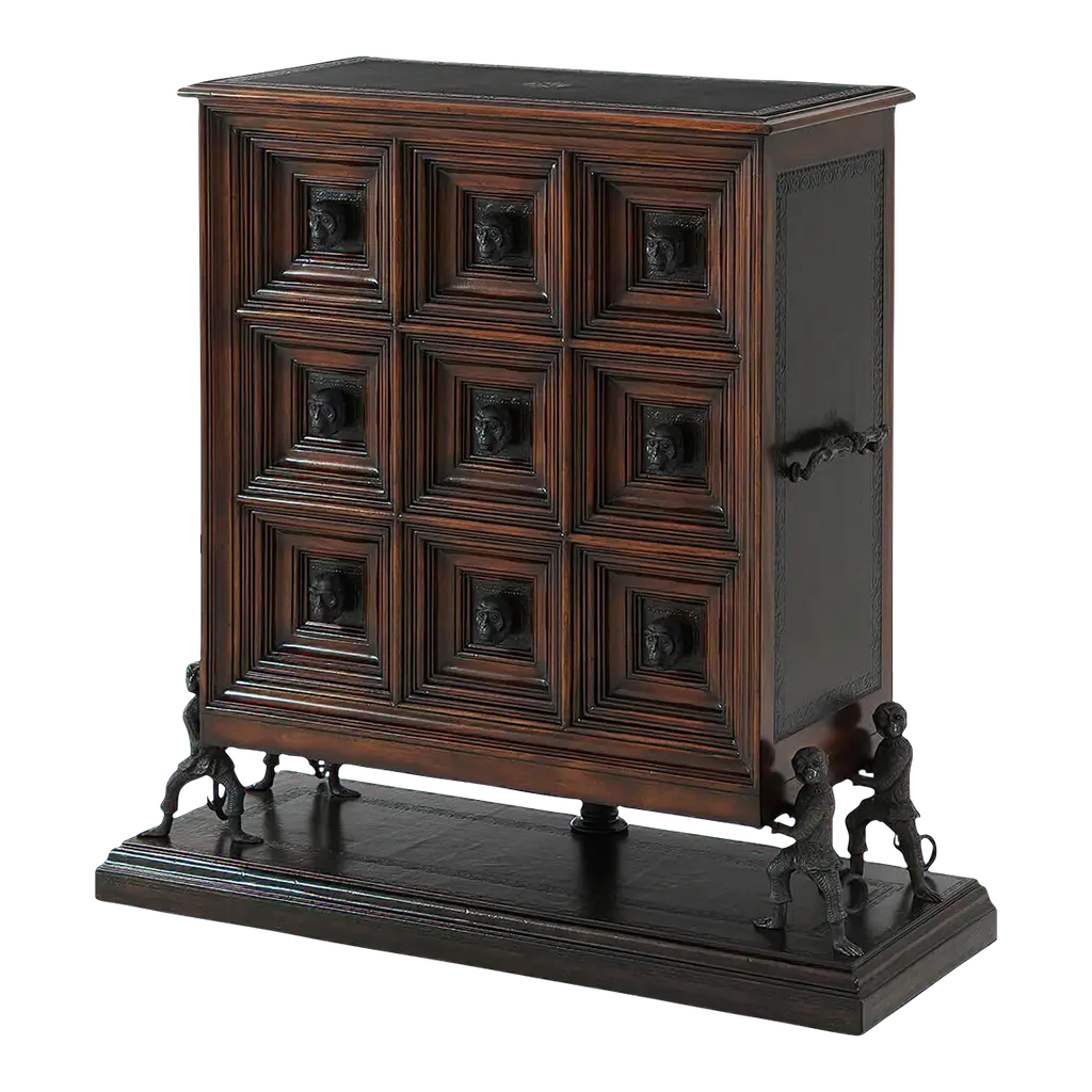 An unusual Italian 19th-century style leather panel chest on stand, with nine drawers having monkey head handles, on four brass monkey supports and a leather plinth base. The original 19th century Italian.Dimension: 42.25" W x 16.5" D x 41.5" H.