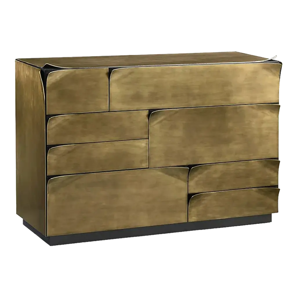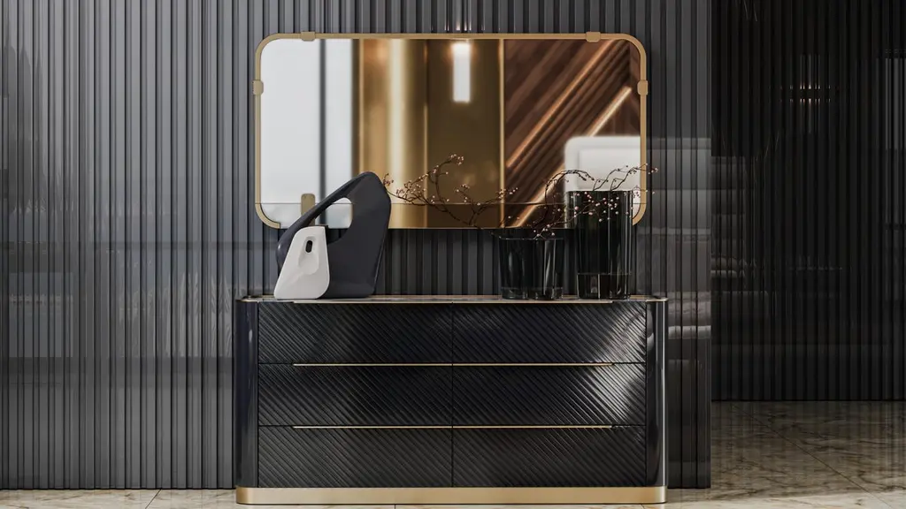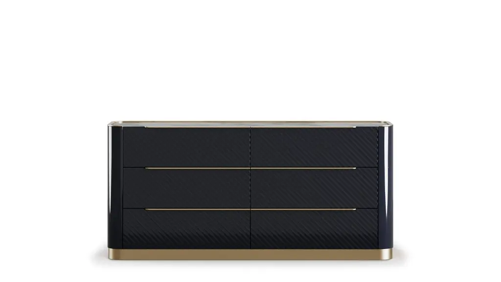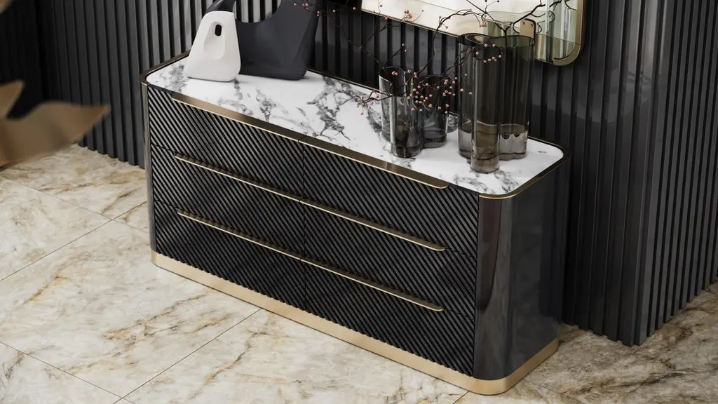 Velara dresser brings modern el egance with its lacquered finish and striking 3D-relief drawers. Accented by brushed brass handles and details, it exudes a touch of luxury. Topped with marble, this dresser is both functional and stylish, perfect for enhancing any contemporary space.