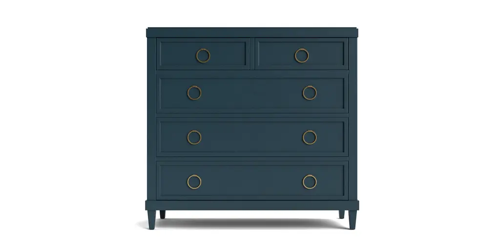 Scaled to be at home in any size bedroom, Bassett's Ventura Colors Chest carries itself with architectural elan and an air of modern classicism. Rising 5 drawers high on tapered legs and wearing a crown of molding, you can store your clothing or bed linens with style in a modest footprint. Choose your preferred color, applied in a semi-opaque finish designed to enhance the natural markings of the knotty elm veneer that covers poplar solids. Another customizing option is a choice of three metal finishes - Satin Brass, Satin Nickel, and Gunmetal - for the sophisticated ring drawer pulls. The bottom drawer is cedar-lined. The entire Ventura Collection is a design delight, offering a common thread through a panoply of textures and finishes that allows you to create a room personalized for your style and needs.