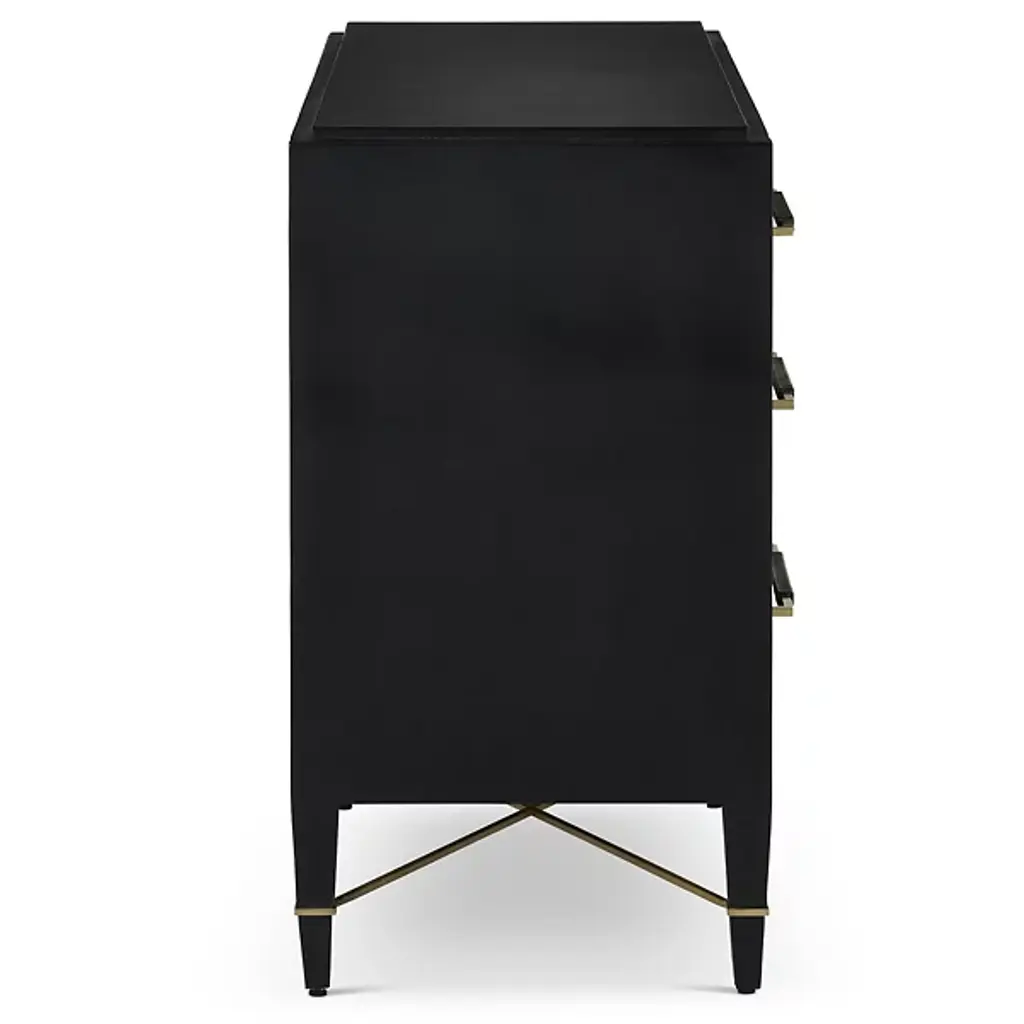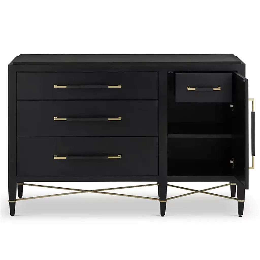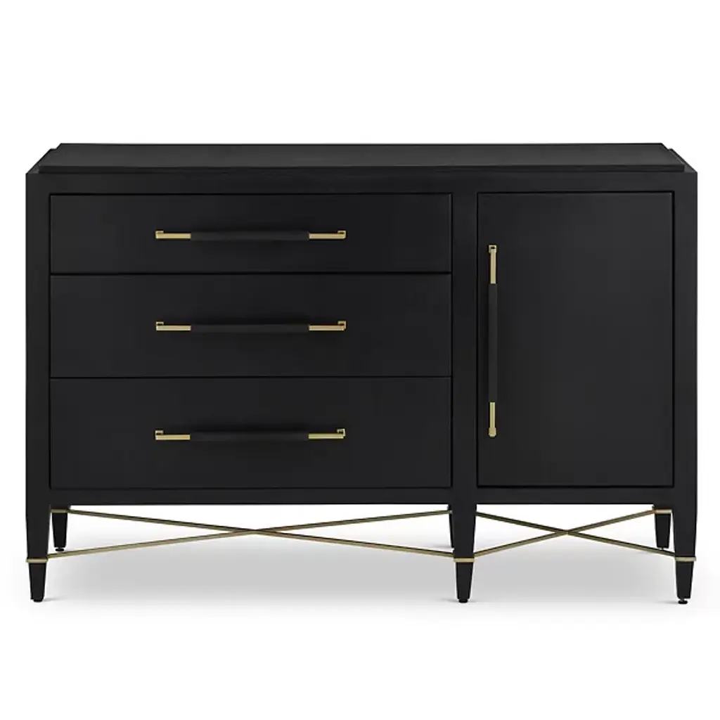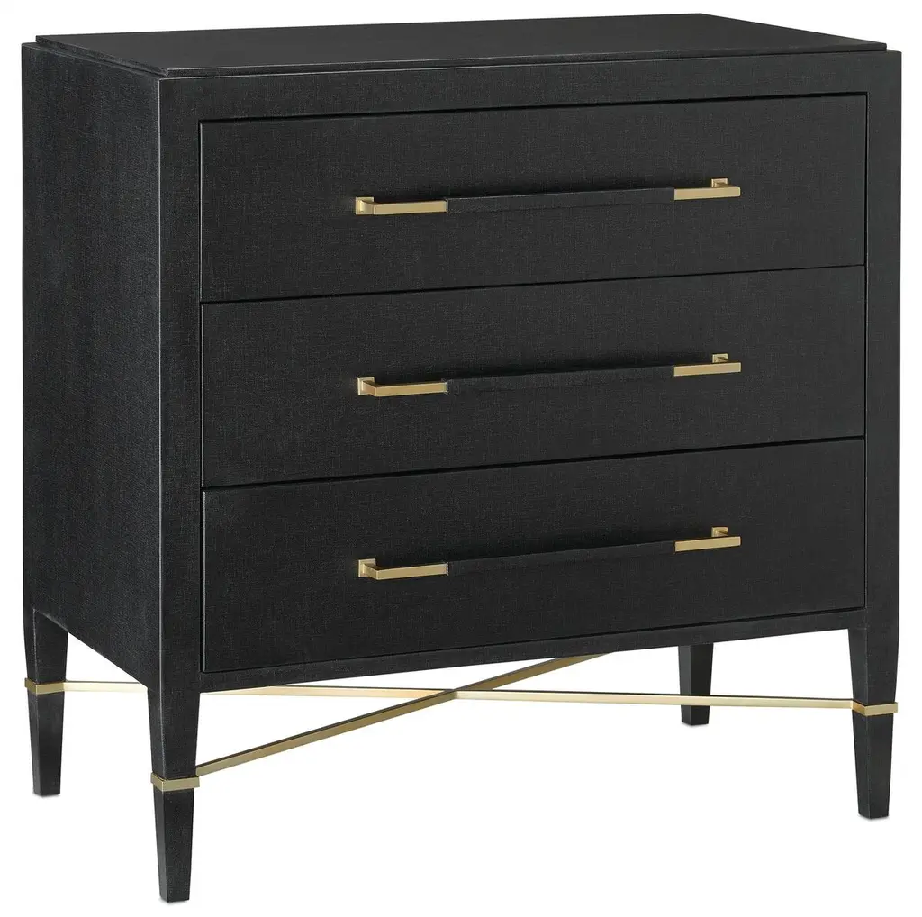 The Verona Three-Drawer Chest from Currey & Company blends storage and style with its transitional design. This iron chest features three generous drawers accented by horizontal handles. The drawers provide plenty of space for clothing and accessories. A streamlined door fitted with a vertically oriented handle adds visual contrast. Crossbeams form an X at the base, giving balance. Adjustable floor glides give this piece mobility, while anti-tip hardware keeps the chest upright while in use.