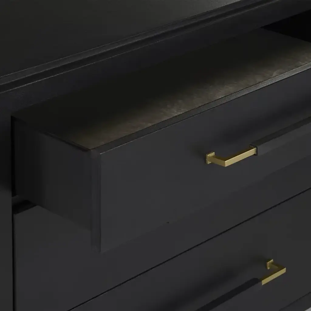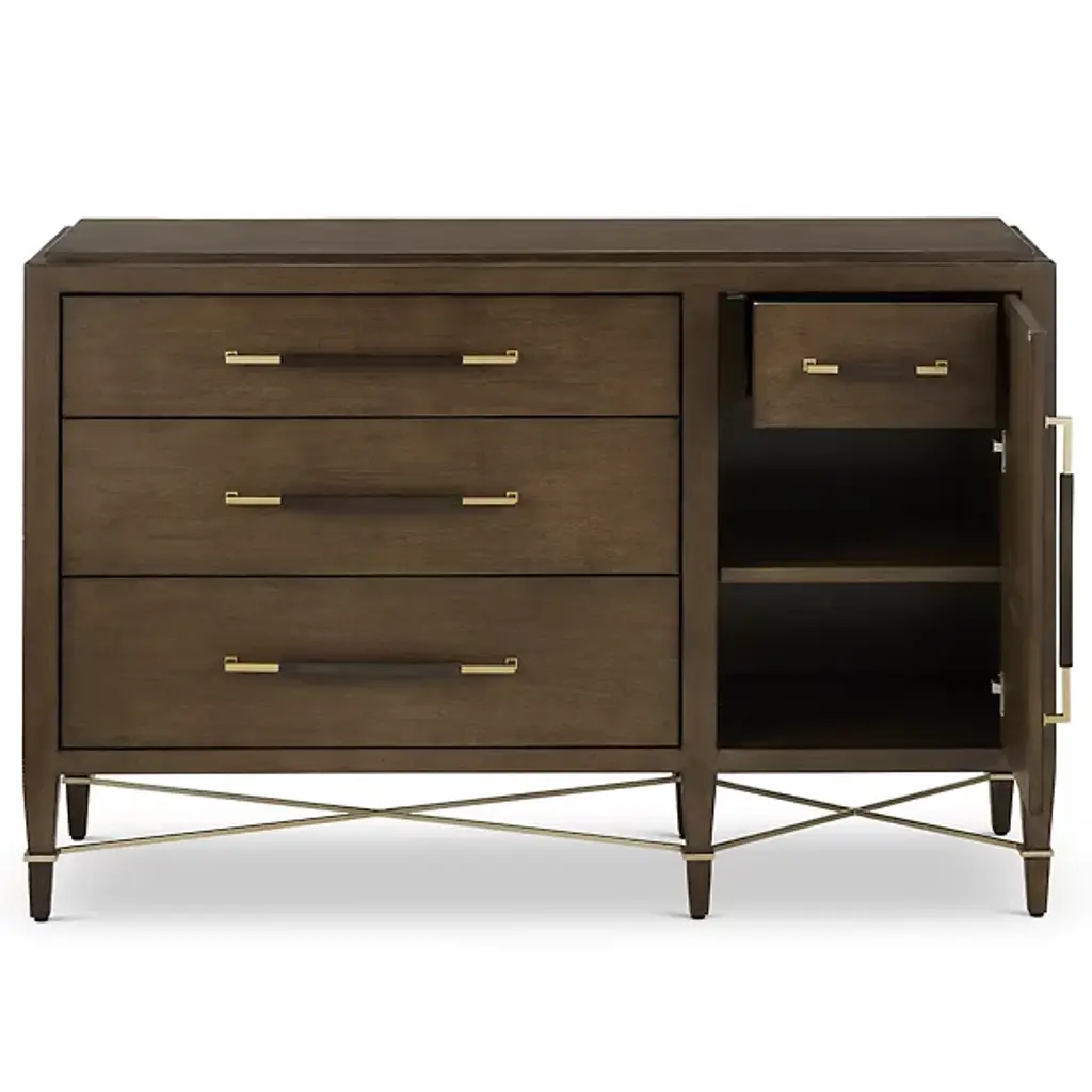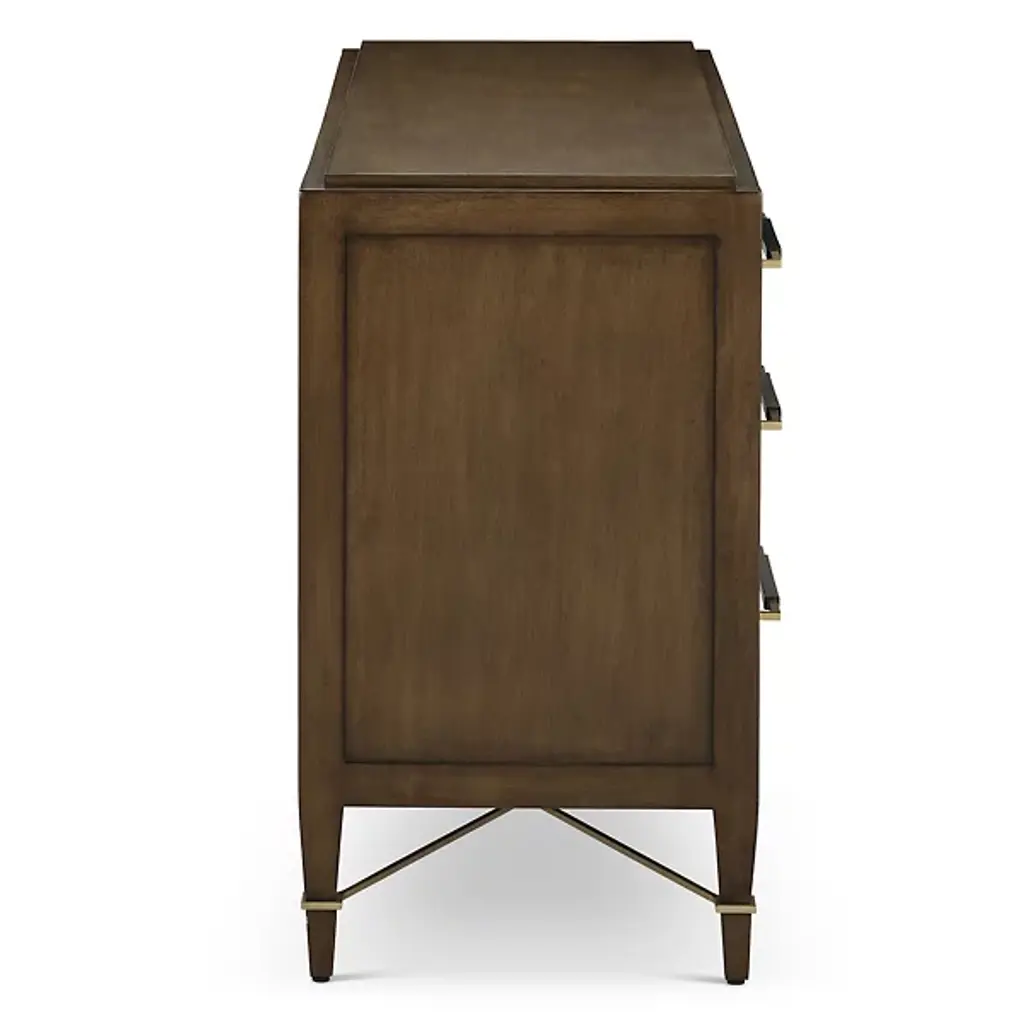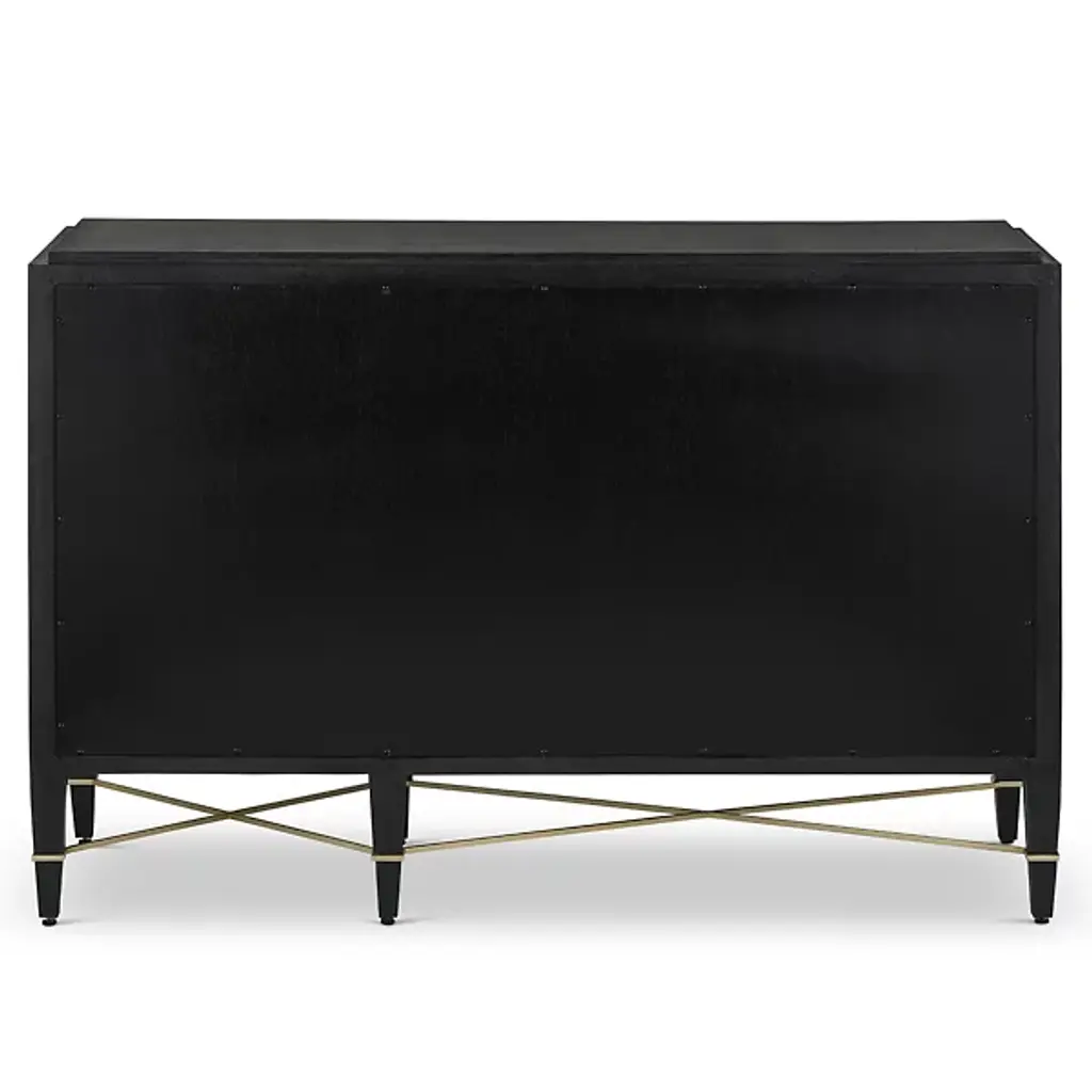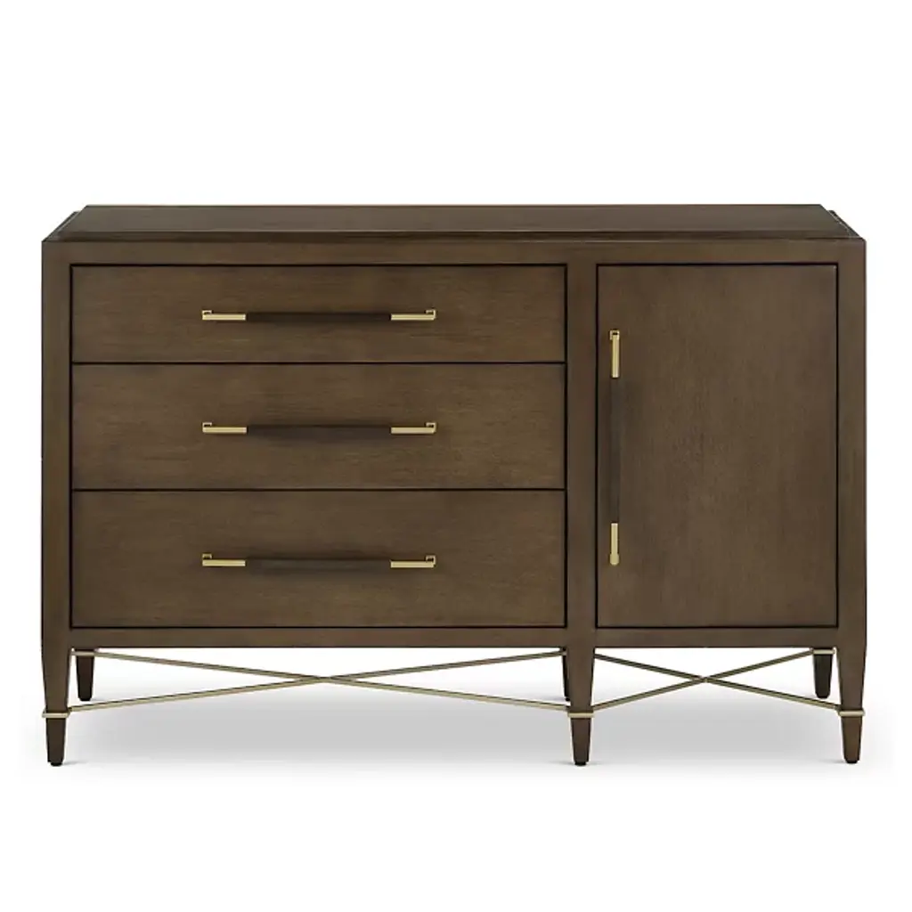 The Verona Three-Drawer Chest from Currey & Company blends storage and style with its transitional design. This iron chest features three generous drawers accented by horizontal handles. The drawers provide plenty of space for clothing and accessories. A streamlined door fitted with a vertically oriented handle adds visual contrast. Crossbeams form an X at the base, giving balance. Adjustable floor glides give this piece mobility, while anti-tip hardware keeps the chest upright while in use.
