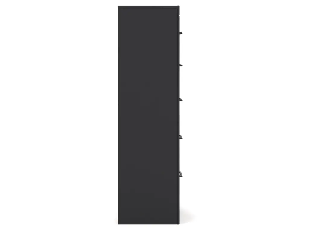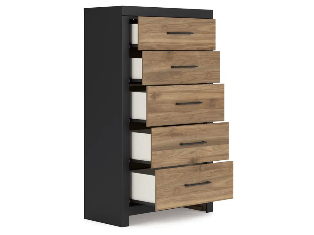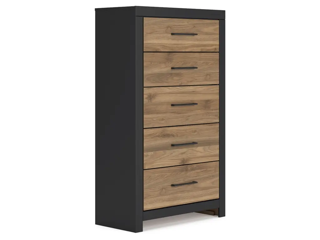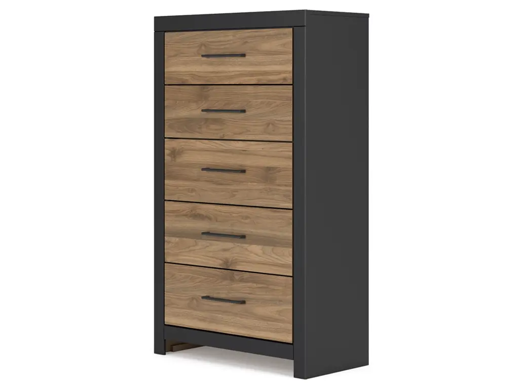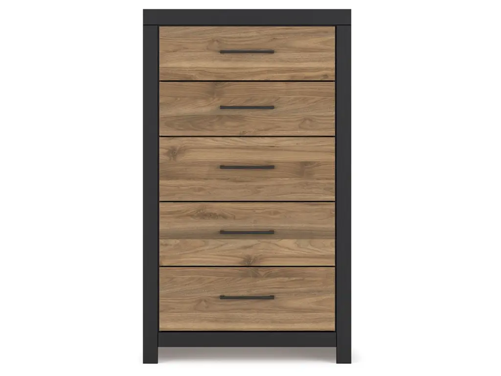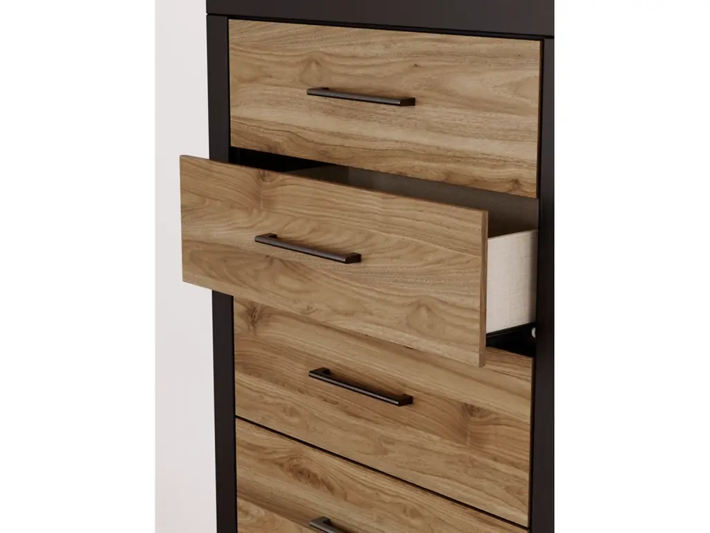 Relaxed yet striking, the Vertani chest of drawers brings casual beauty and function to your dream destination. You're sure to love its spacious drawers that glide open and offer plenty of storage for your wardrobe and spare bed linens. A delightful two-tone treatment blends a fresh replicated walnut grain with a matte black finish, while sleek handles in an antiqued gunmetal finish lend a contemporary touch.