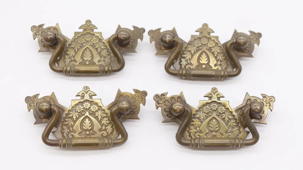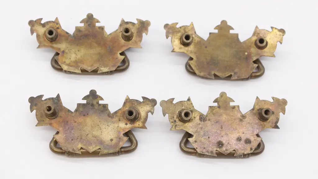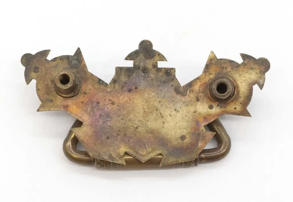 Victorian style dresser drawer pull made of brass with an antique patina finish. Mounting screws are included. Good condition with surface wear from prior use. Priced each. The manufacturer and exact date of creation are unknown. The dimensions are 4 in. L x 2 in. W x 0.75 in. D, center to center 2.5 in.