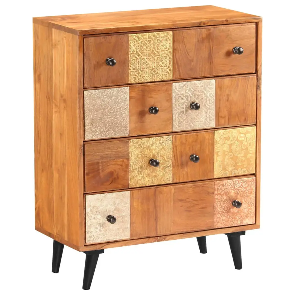 This chest of drawers brings vintage style while providing a handy storage solution for your home. With its sturdy solid acacia wood and decorative inlays, it’s not just practical but also adds to the look of your space, whether it’s your bedroom, living room, or hallway. Storage Capacity: With four spacious drawers, this chest gives loads of storage space, ideal for keeping clothes, books, and other bits out of sight yet easy to grab when needed.Vintage Design: The vintage style elevates any room, showcasing the charm of the past while fitting into modern homes. This attractive design combines nostalgia with practicality.Sturdy Build: Made from solid acacia wood, this unit is designed to last, so you can rely on its durability and strength over time.Decorative Touch: The decorative inlays add a unique element that enhances the chest's beauty, making it a focal point of your home decor.Versatile Use: Perfect for a range of settings, from bedrooms to living rooms. Its versatility means you can move it around your home depending on your needs.