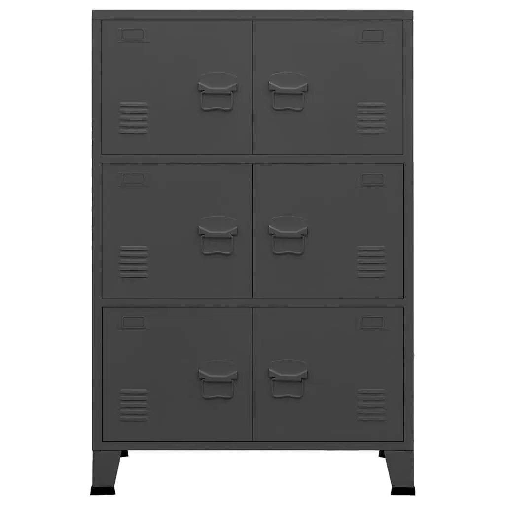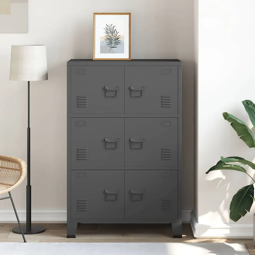 This Industrial Metal Storage Chest is a handy piece of furniture that combines practicality with a distinct style. Perfect for home or office use, it gives your space a fresh look with its sleek anthracite finish while offering tons of storage to keep your things tidy and easy to grab. Ample Storage: This storage chest features plenty of space for all your items. With six compartments and built-in shelves, it makes it easy to keep everything tidy.Industrial Design: The tough, industrial style makes this storage chest a standout piece. Its matte finish and smooth feel add a modern touch that fits with any decor.Durable Material: Made from quality metal, this storage chest is built to last while maintaining its stylish look. The powder-coated finish helps it withstand daily wear and tear.Efficient Organization: With metal handles and air vents, this chest makes it easy to access your items while promoting airflow. Perfect for those who like to stay organized while keeping things looking good.Secure Storage: The storage chest comes with a device to attach it to the wall, enhancing safety. Ideal for homes with children or pets, it minimizes the risk of tipping over.