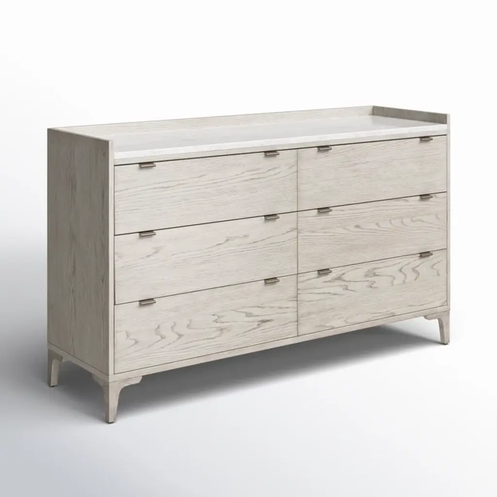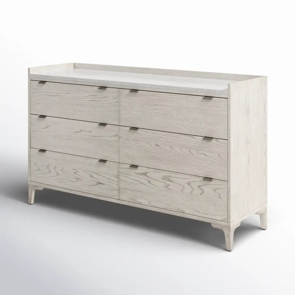 Vintage white oak is finished with a dry hand for a light look, while a top of white Italian marble offers a sophisticated material mix. Six spacious drawers bring generous storage space to the bedroom.