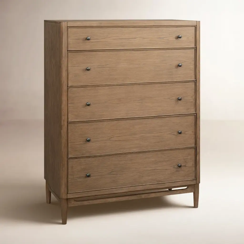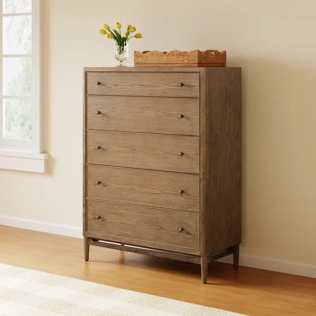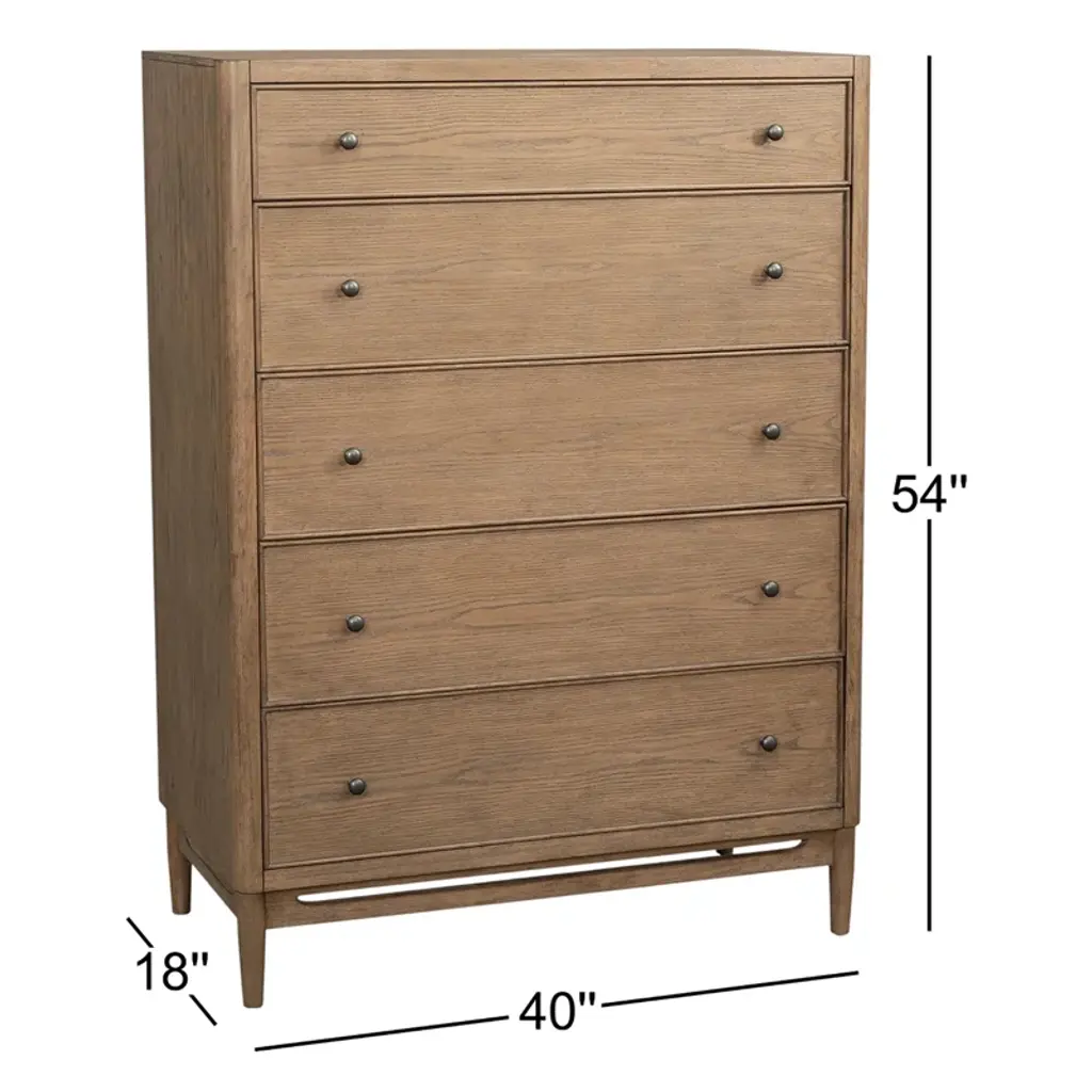 Make a statement with the Violet drawer chest, designed for those seeking true transitional elegance. The soft curved base details and rich medium brown oak finish create an elevated bedroom space. Fashioned from rubberwood solids and white oak veneers, and adorned with antique bronze hardware, this chest is sure to be an enduring staple in your home. With ample space in five soft-closing drawers, the Violet is the ultimate in functionality and sophistication.