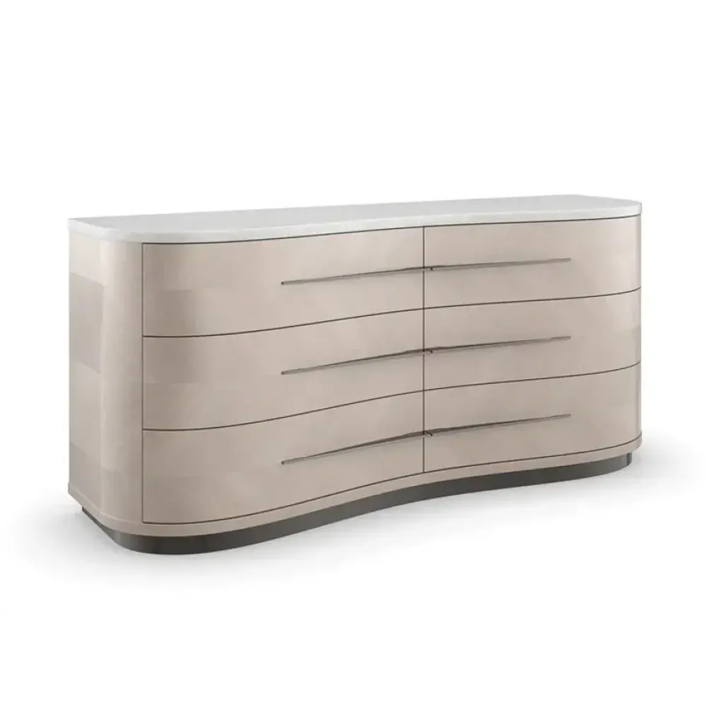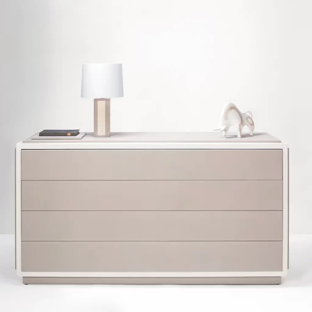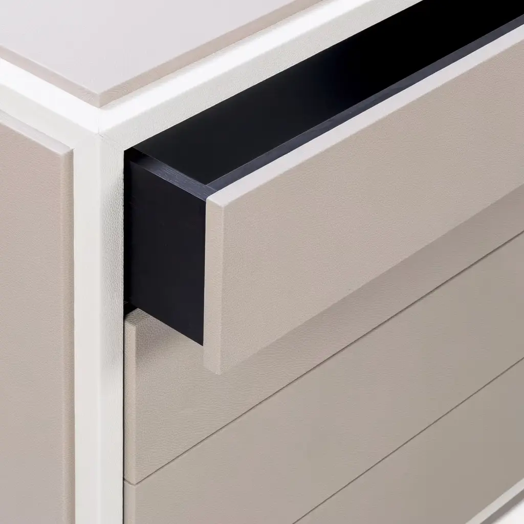 This exquisite 4-drawer dresser is a piece of sophisticated, timeless elegance entirely wrapped in soft leather that will create a luxurious ambiance and brighten up any bedroom decor. Floating on a recessed plinth base, the cream leather drawers are enclosed in a sleek white frame. Drawers are equipped with a soft-closing system and suede lining. Please contact the Concierge for available size customization.