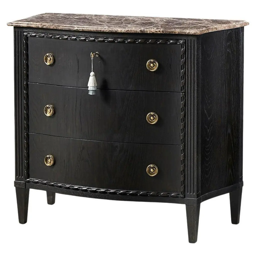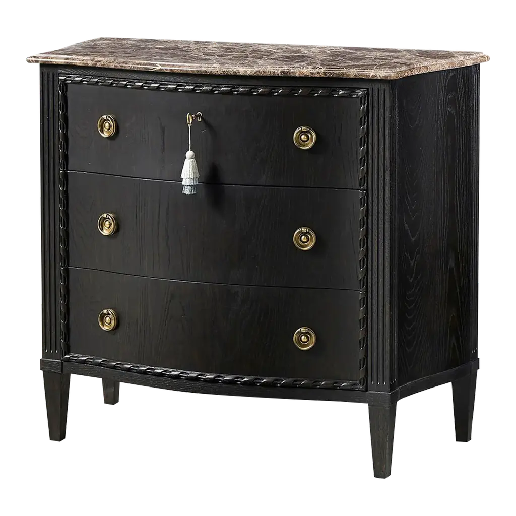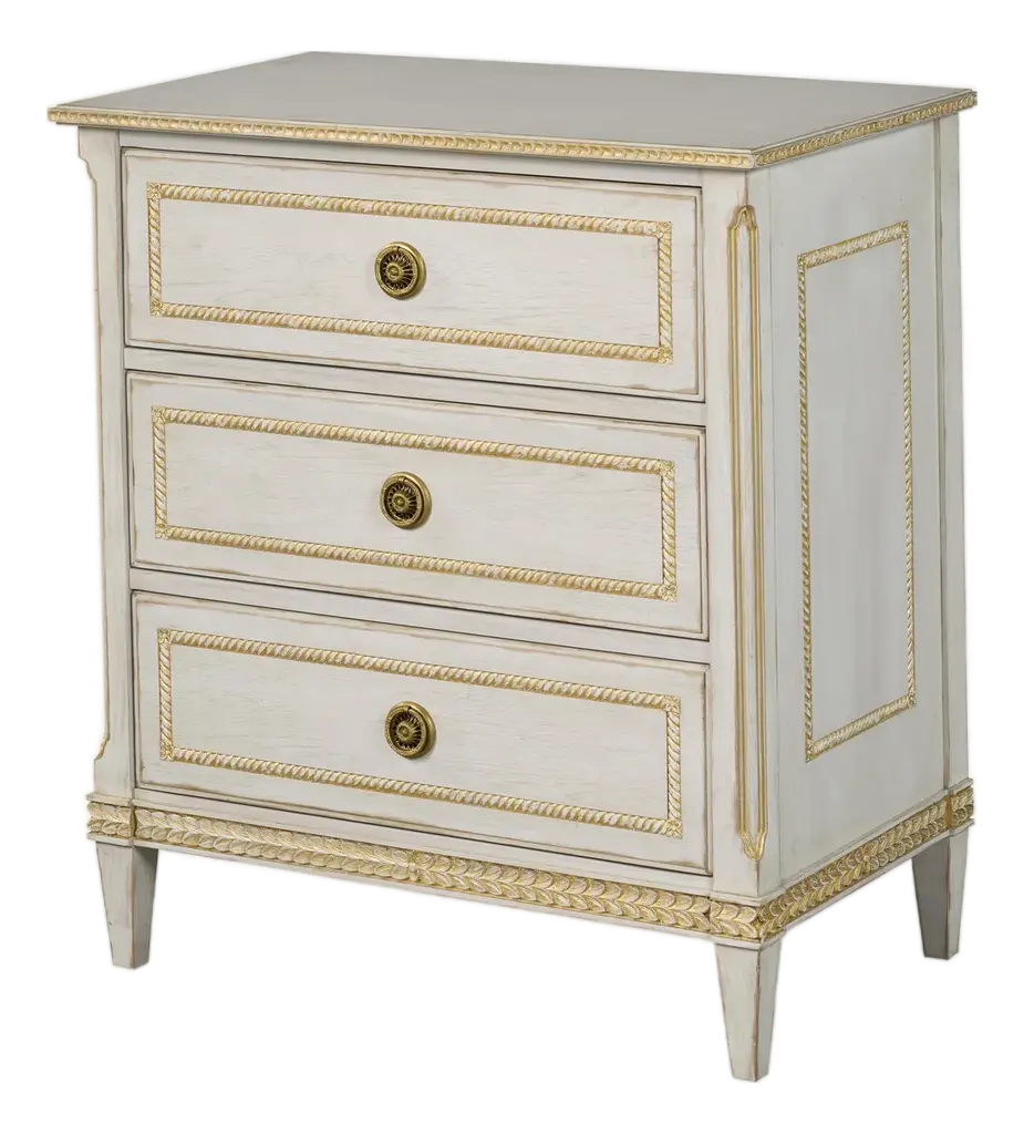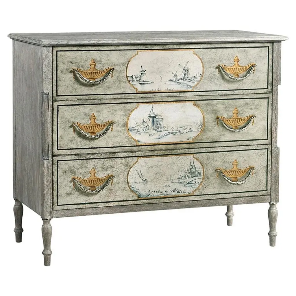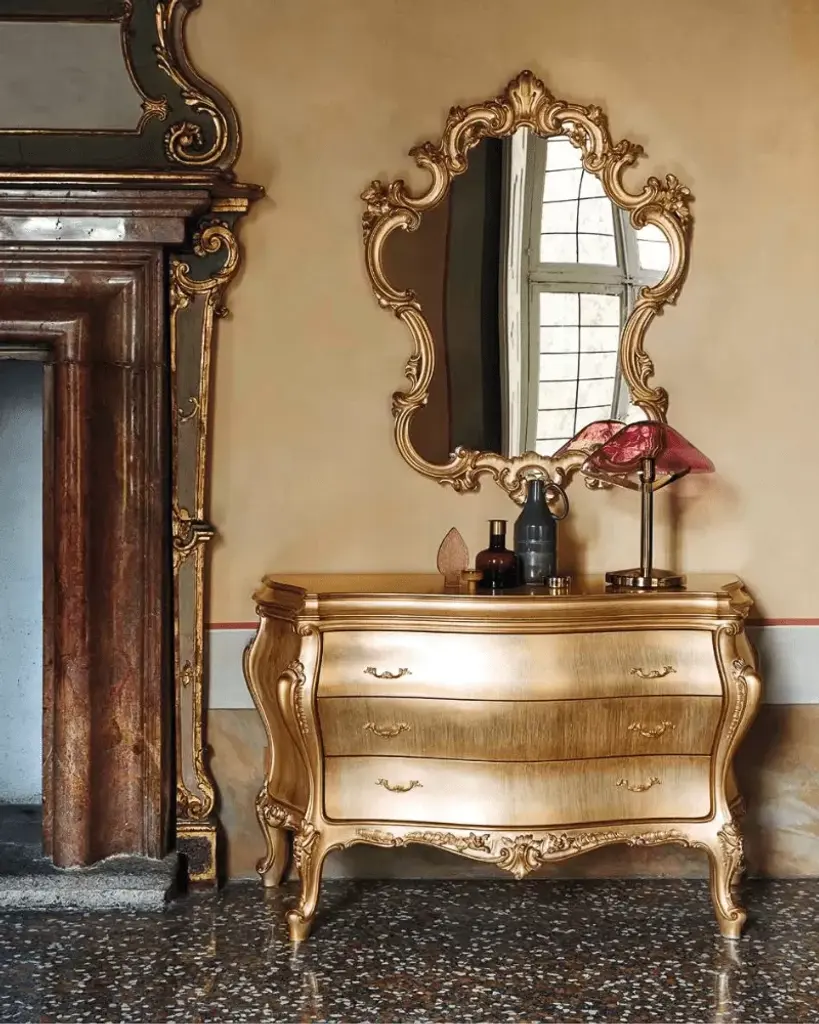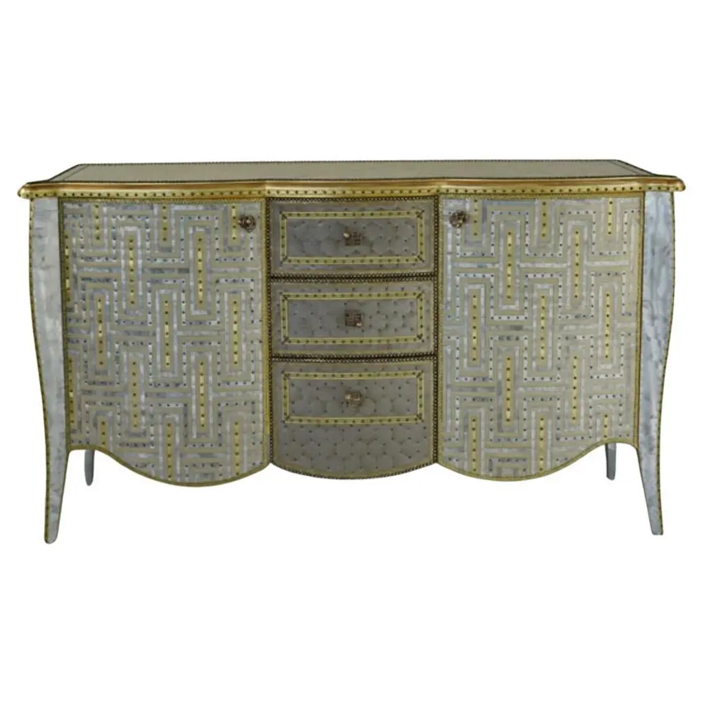 Crafted from solid mindi and finished in textured gold leaf. Decorative mirror and eglomise accents. Three drawers.