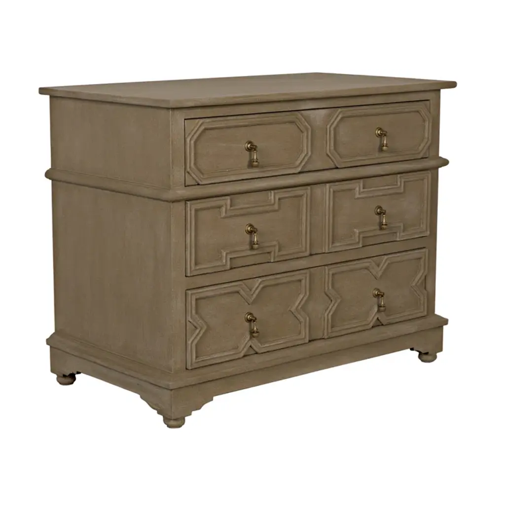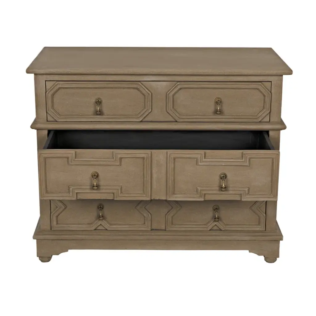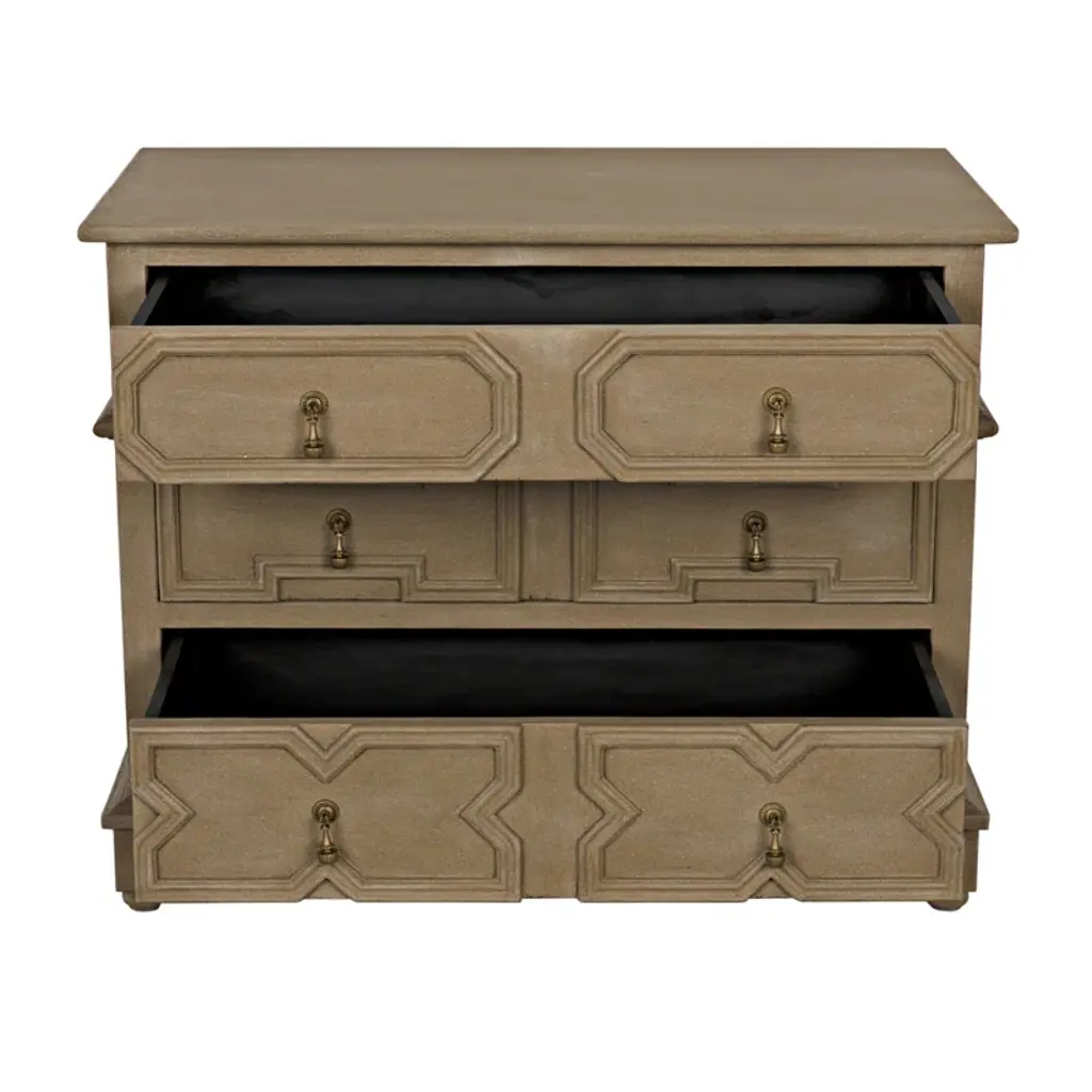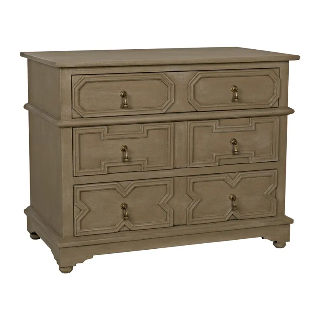 This dresser effortlessly combines classic design with practical functionality. Made from a blend of solid and engineered wood, it showcases the rich texture of mahogany, offering both beauty and durability. With three spacious drawers featuring roller glides and removable brass handles, it provides ample storage while maintaining a sleek, horizontal silhouette. The dresser's weathered finish adds a touch of rustic charm, making it a versatile piece for any bedroom.