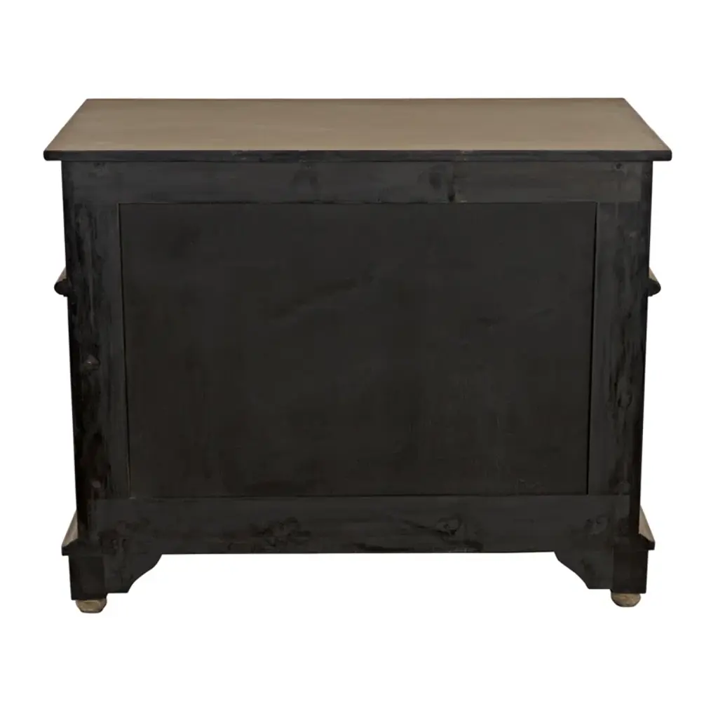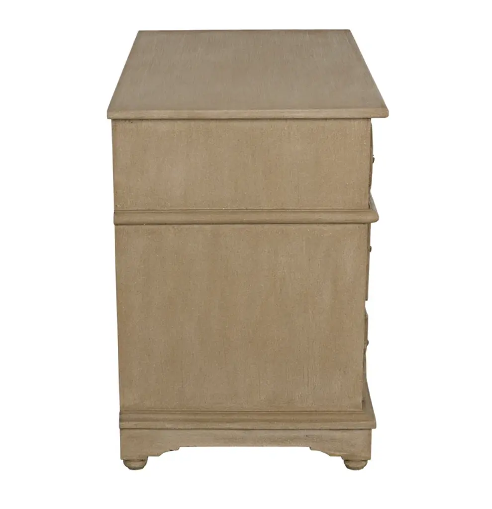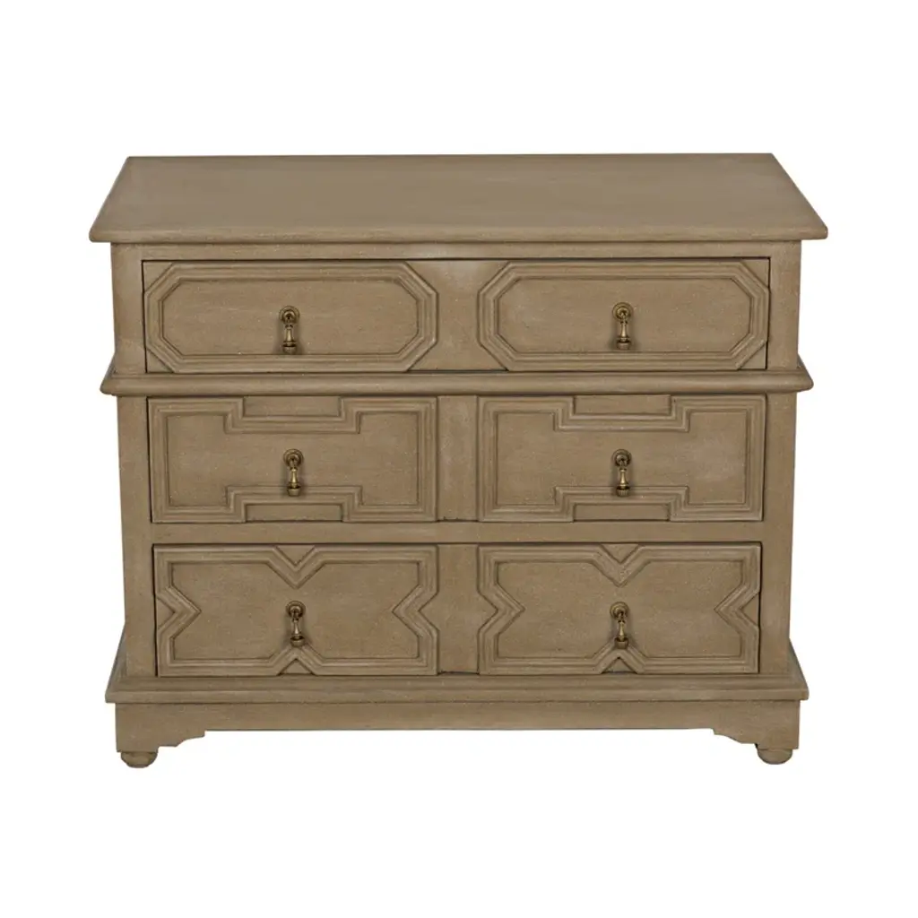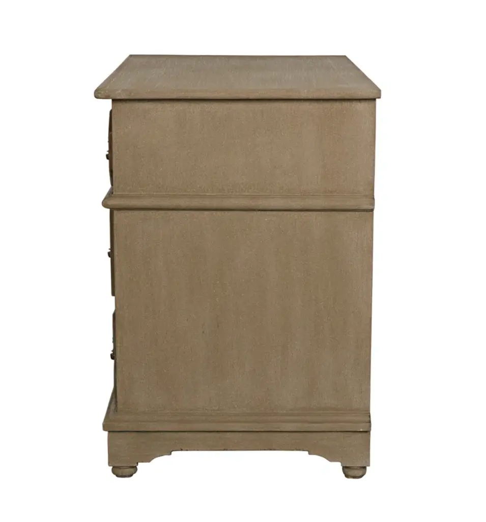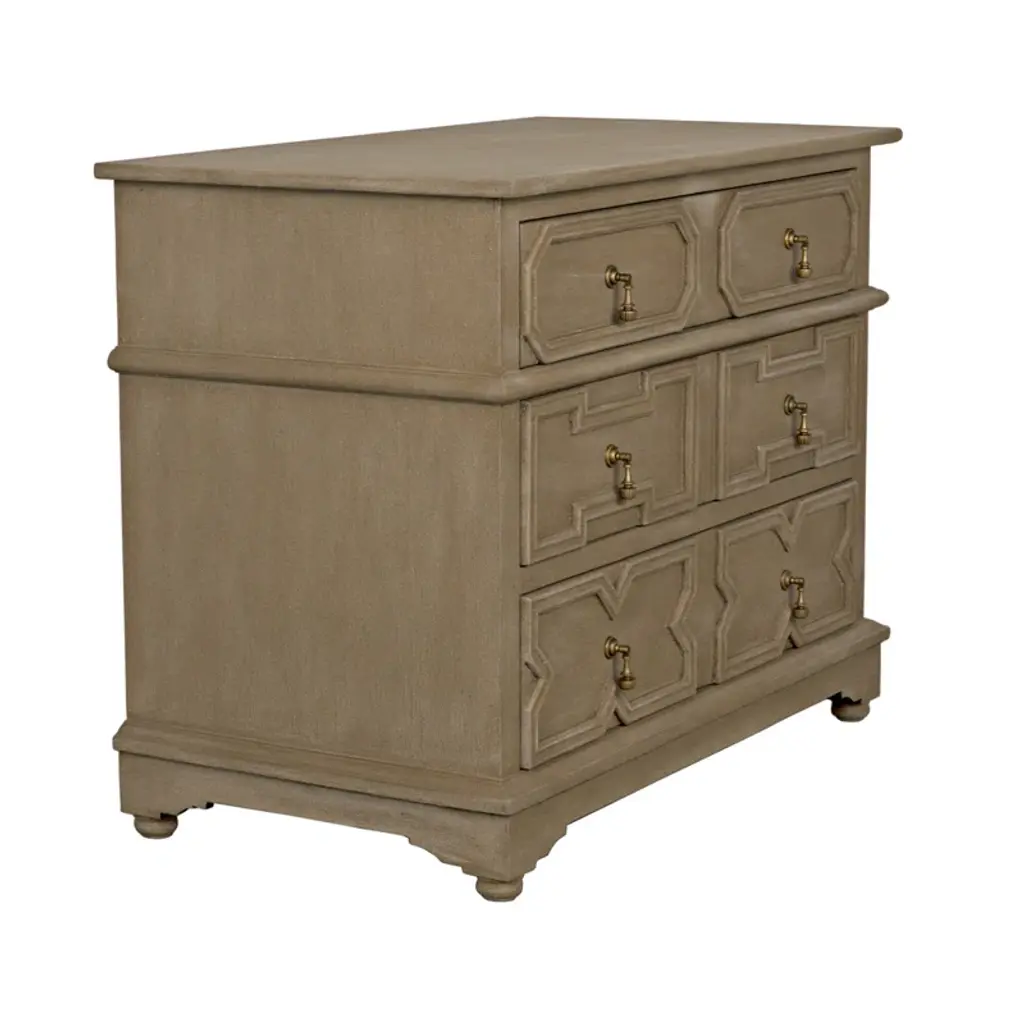 This dresser effortlessly combines classic design with practical functionality. Made from a blend of solid and engineered wood, it showcases the rich texture of mahogany, offering both beauty and durability. With three spacious drawers featuring roller glides and removable brass handles, it provides ample storage while maintaining a sleek, horizontal silhouette. The dresser's weathered finish adds a touch of rustic charm, making it a versatile piece for any bedroom.