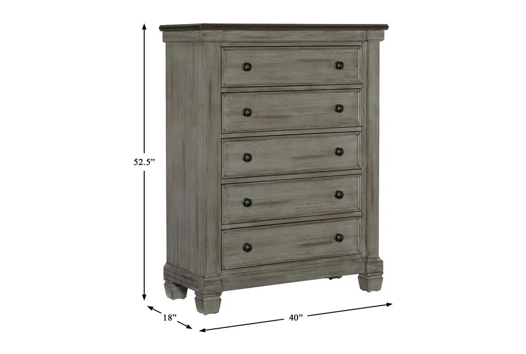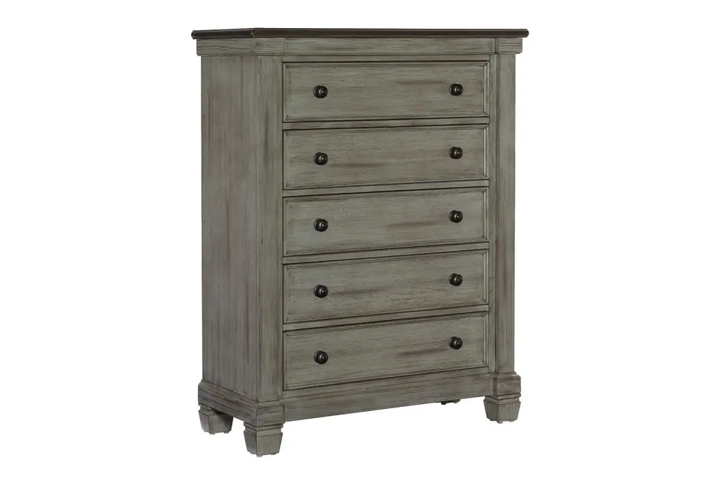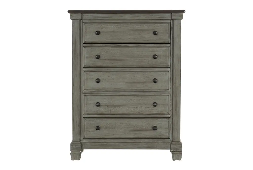 The Wheeler 5-Drawer Chest brings a touch of rustic charm to your home with its 2-tone finish in coffee and antique gray. Crafted from Asian hardwood, this chest of drawers combines durability with a timeless design, making it a perfect addition to any casual or rustic-styled room. You will love having this chest of drawers in your bedroom.
