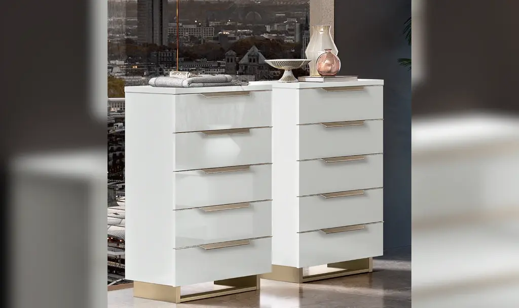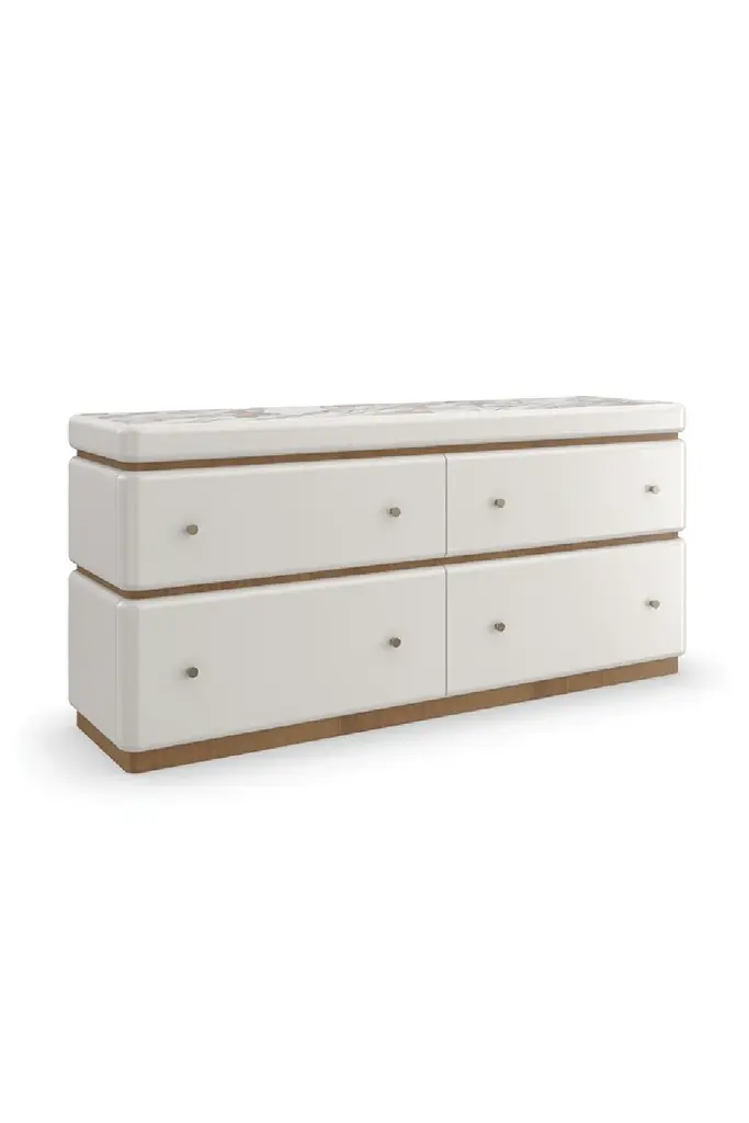 Evoking the timeless beauty of seaside villas in the Mediterranean, this modern dresser introduces an architectural element with subtle curves and softened edges. Simple, stacked shapes are trimmed in Toasted Pecan, with a Calcutta Oro marble top for a luxe yet durable design detail. Features four soft-close drawers with painted interiors, and a removable felt lined tray that neatly tucks away in the top drawer. Pairs perfectly with our Malta upholstered bed.