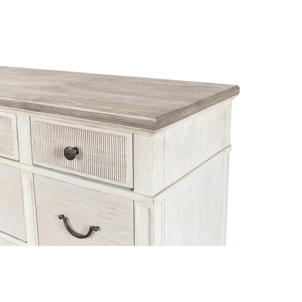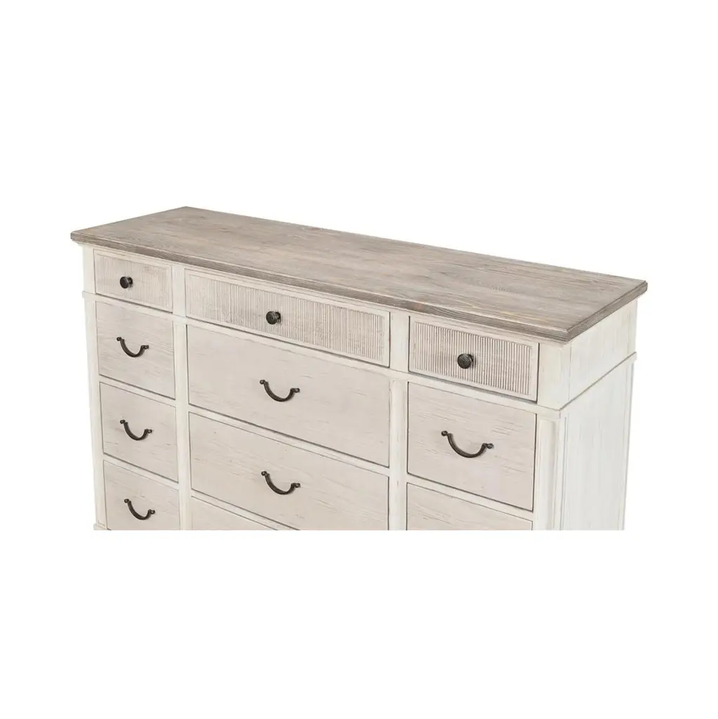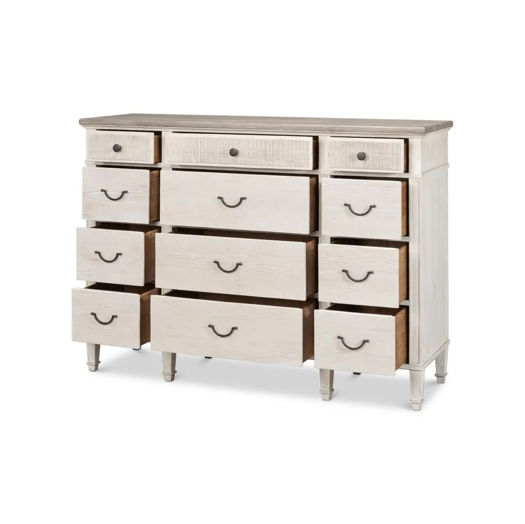 This dresser is meticulously crafted to embody the essence of a seaside retreat with its light, weathered finish and classic clean lines.With 12 graduated drawers and an abundance of storage that won't overwhelm your space. Made from beechwood, in a white painted finish to the case and gray moonskin finish on the top. Crafted for versatility, the dresser is not just a fit for coastal bungalow vibes; it can seamlessly adapt to a wide array of interior styles, from country chic to contemporary minimalism.Dimensions: 63" W x 19" D x 45" H