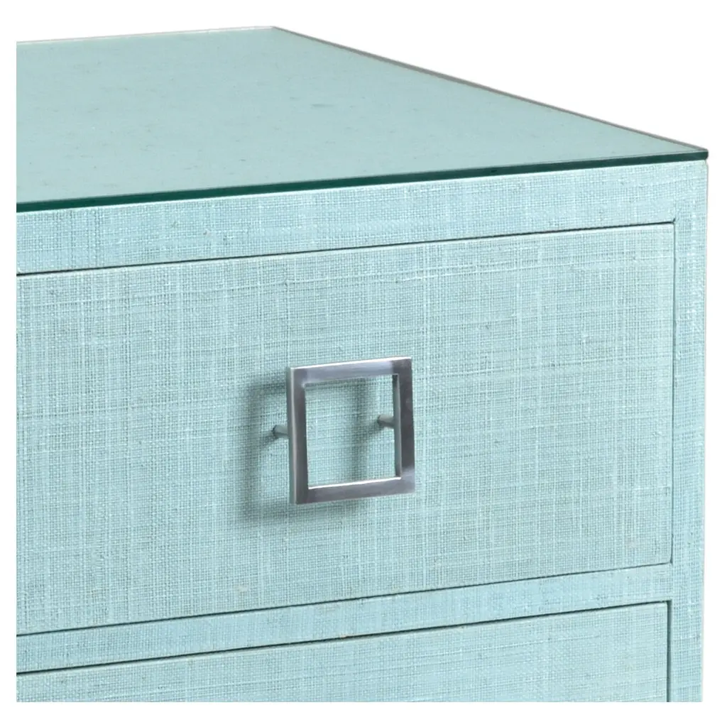 CHLOE CHEST - BLUE. 3-DRAWER BEDSIDE CHEST. WOOD CONSTRUCTION.COVERED IN PAINTED RAFFIA, A GLASS TOP AND BRUSHED NICKEL HARDWARE.
