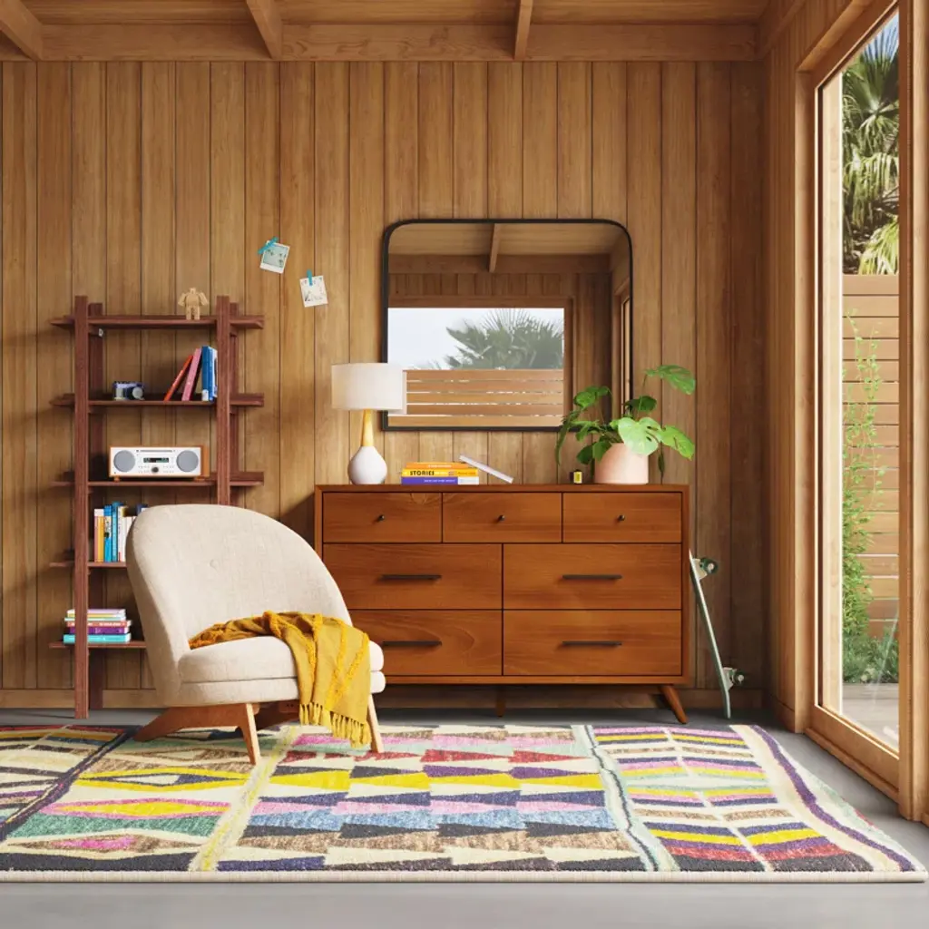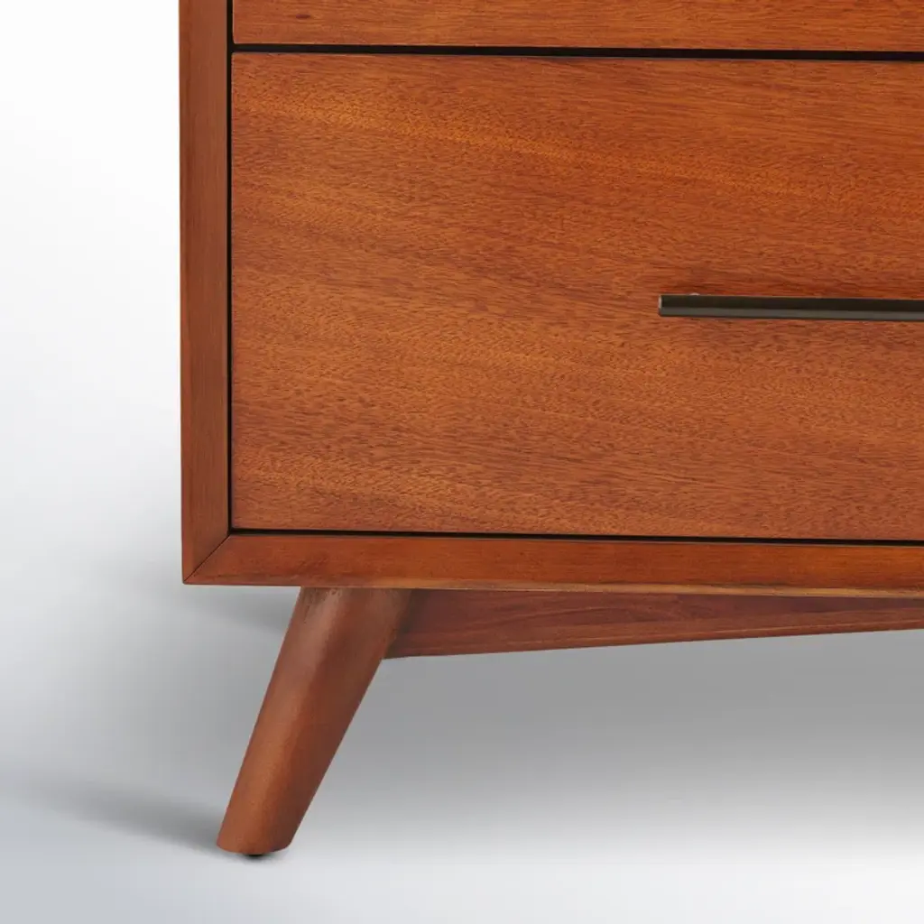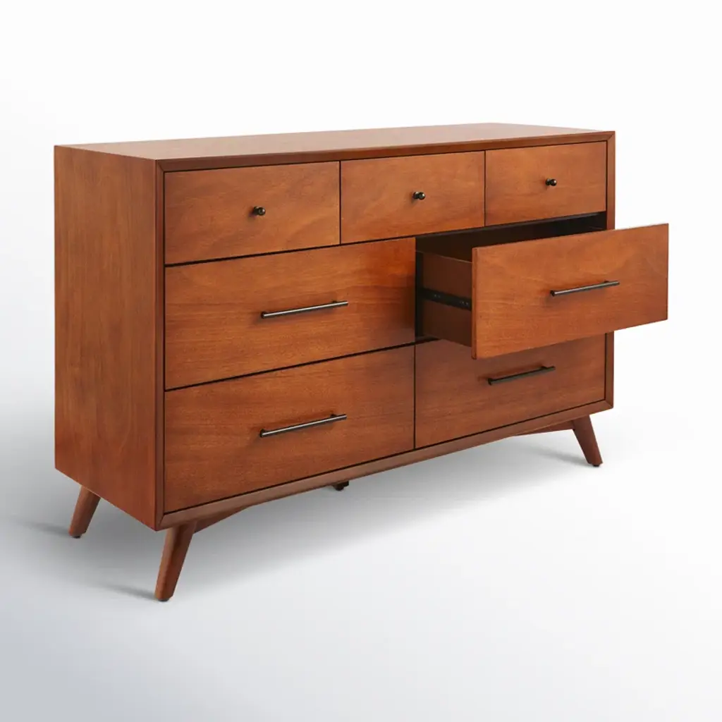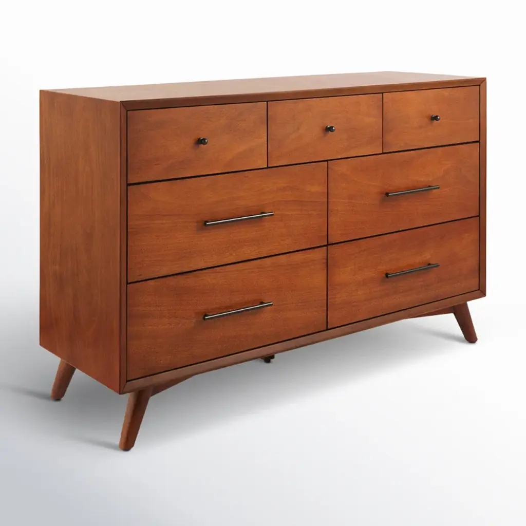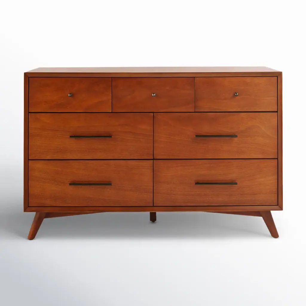 With a crisp, clean-lined silhouette and tapered feet, this 7-drawer dresser brings mid-century style to your bedroom. Distinctive wood grains layer in an organic feel. Dovetail joints and smooth-opening ball bearing glides enhance the functionality of the drawers. Three felt-lined ones on the top row are great spots for your more delicate items.