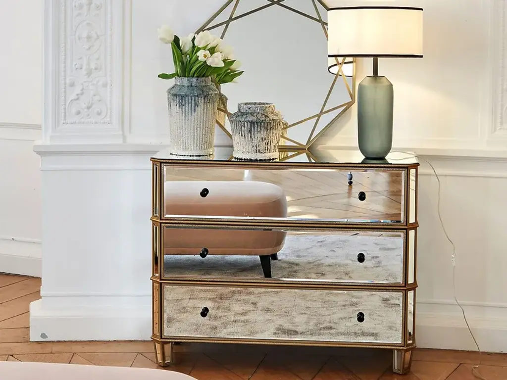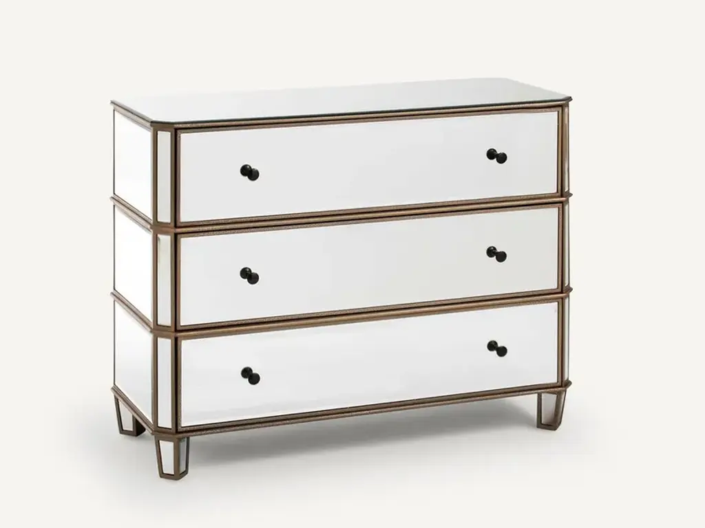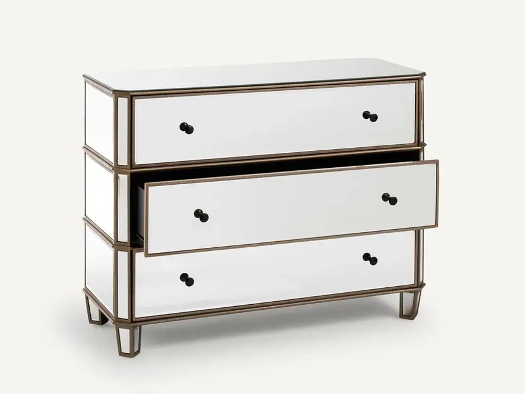 WINSOME is a drawer unit entirely covered in mirrored glass.Features:Mirror-covered MDF structure3 drawersDelivered assembled