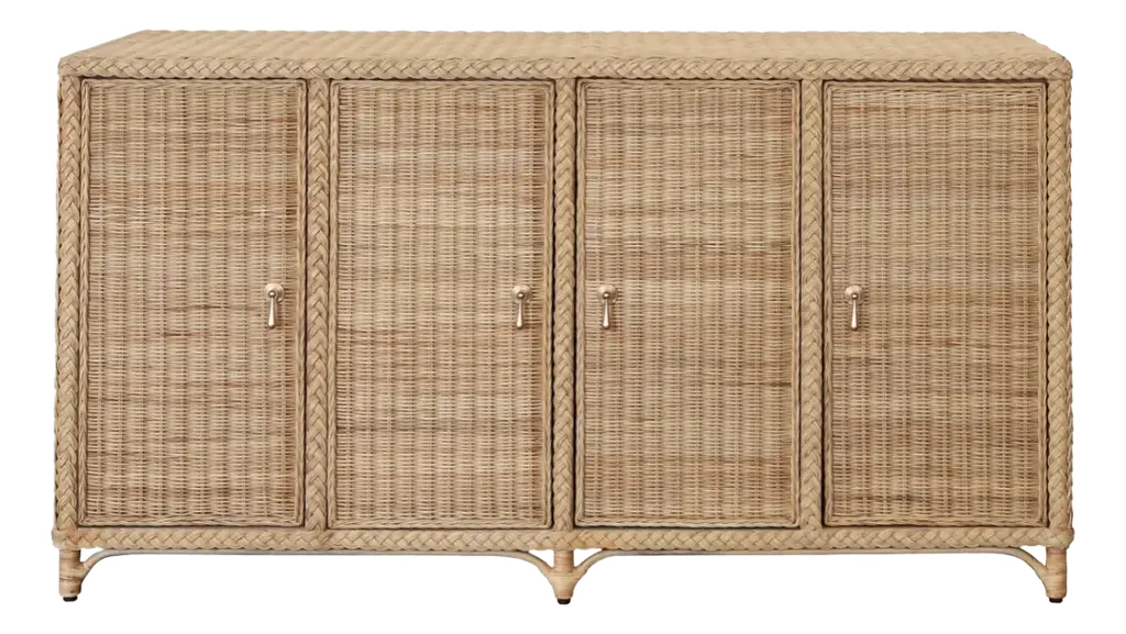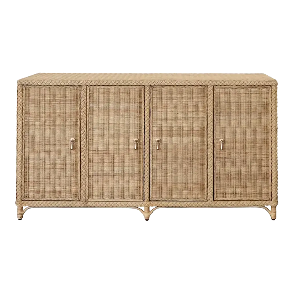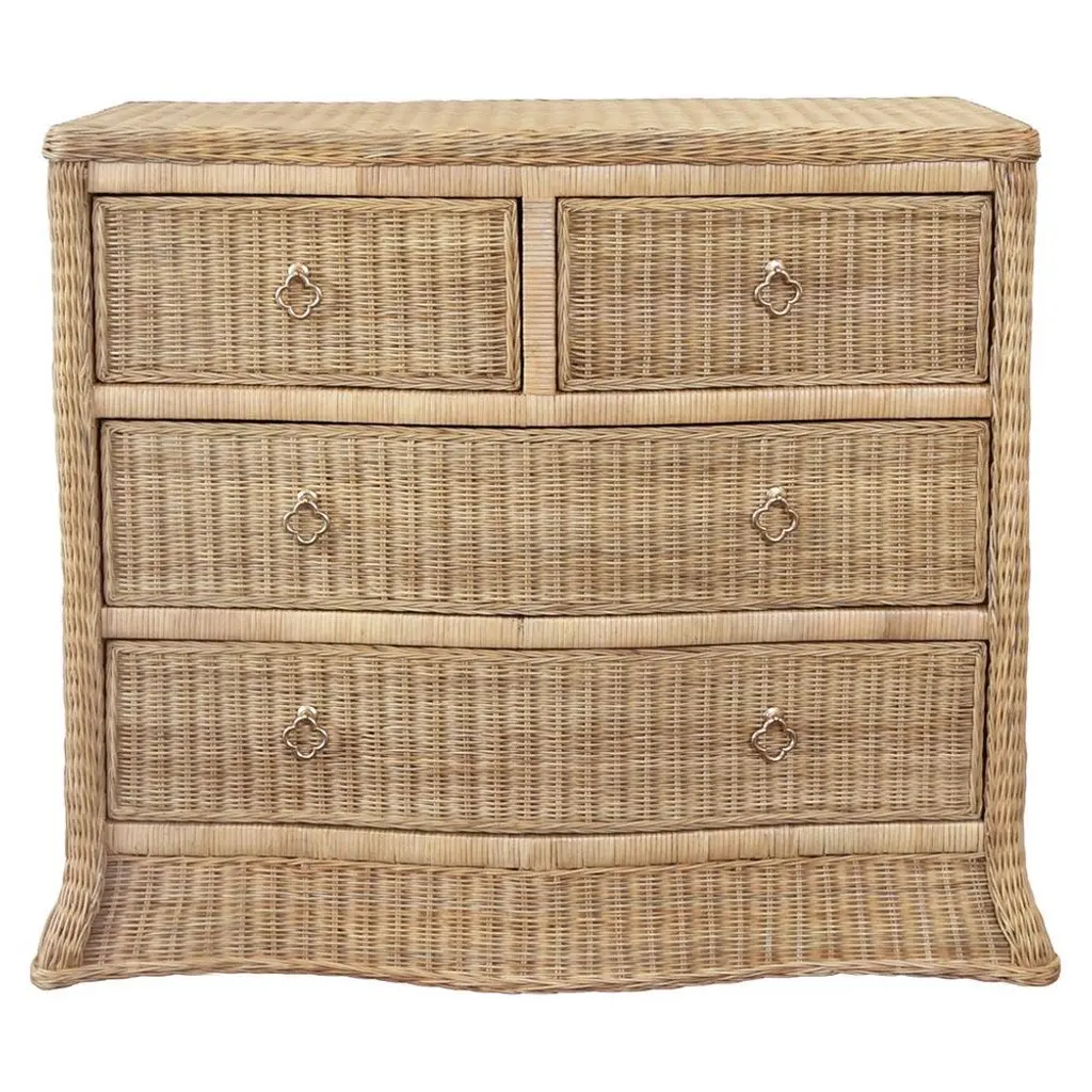 This beautiful Celine chest by Worlds Away is crafted with woven rattan. Both modern yet classic, this chest features four drawers with soft close glides accented with satin brass hardware.