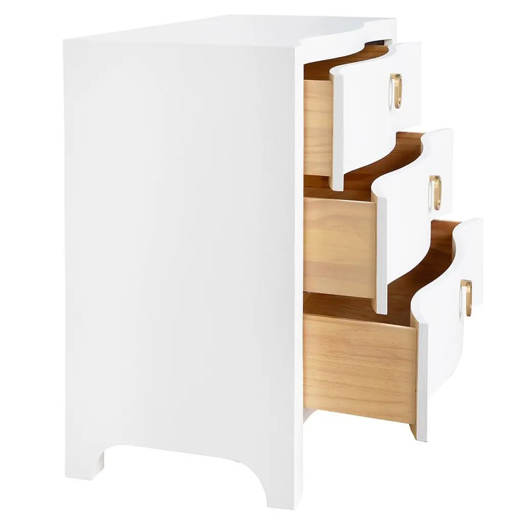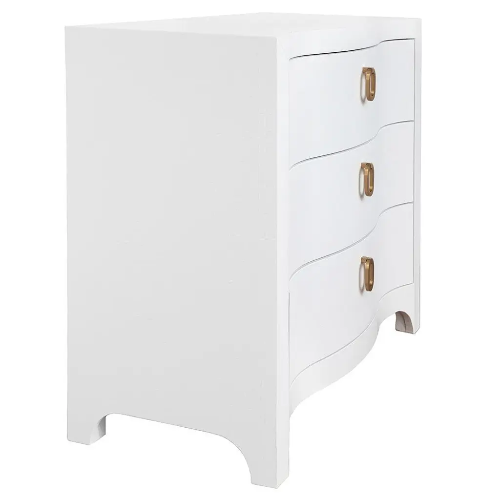 Complete the look of your modern classic bedroom space with our Carol Modern Classic White Linen Brass Pull Bachelor Chest. Expertly crafted from wood and linen, this designer bachelor chest features a curved front chest with three drawers in a white textured linen with satin brass ring hardware and soft close glides.