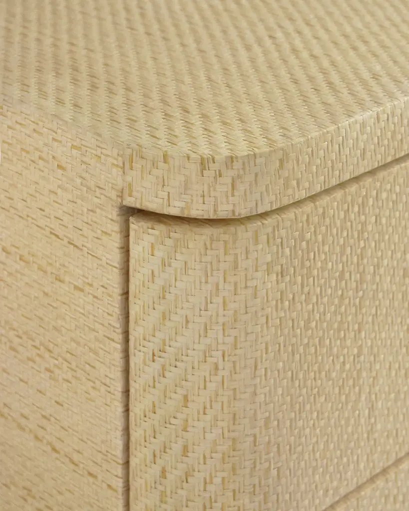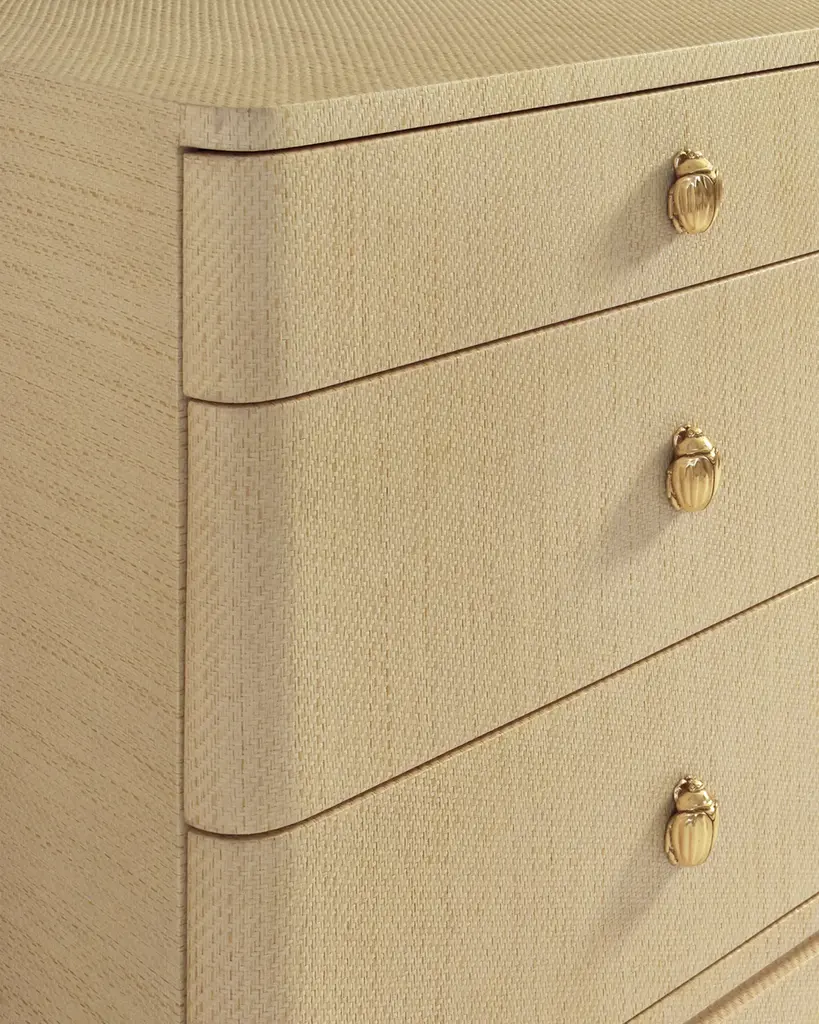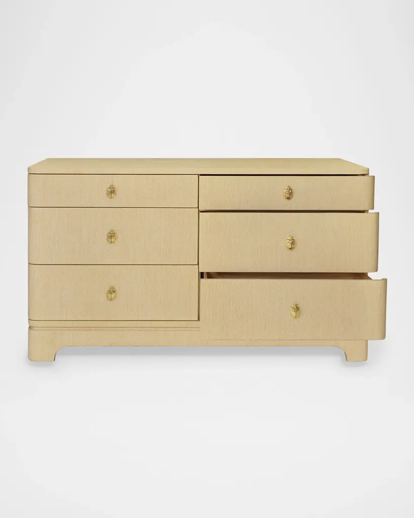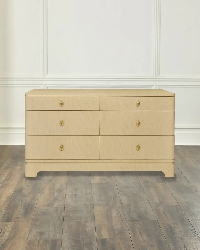 This simple yet chic storage piece is wrapped in grasscloth for organic appeal and accented with eye-catching brass beetle handles on each drawer. The rounded edges and lacquered finish add a timeless and elegant touch. Handcrafted of pine wood, wood composite, and grasscloth Six soft-close drawers Overall, approx. 62"W x 21"D x 35"T Includes hardware Wipe clean Weight, 250.0 lbs Imported Boxed weight, approximately 266.0 lbs Shipping Direct from Vendor, usually ships within 30 business days. About Worlds Away: Worlds Away transcends design boundaries, offering a curated collection of furniture and decor that embodies global sophistication. With an eclectic mix of styles, its pieces are a fusion of luxury and functionality, creating spaces that resonate with individuality and cosmopolitan charm.
