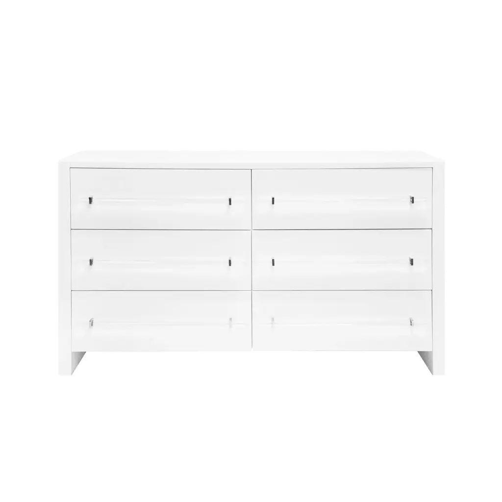 The best selling Worlds Away Luke dresser features six smooth opening drawers on glides, accented with sleek cylinder acrylic & brass or acrylic & nickel hardware. A perfect accompaniment to your Farmhouse, Industrial or Mid Century interiors!