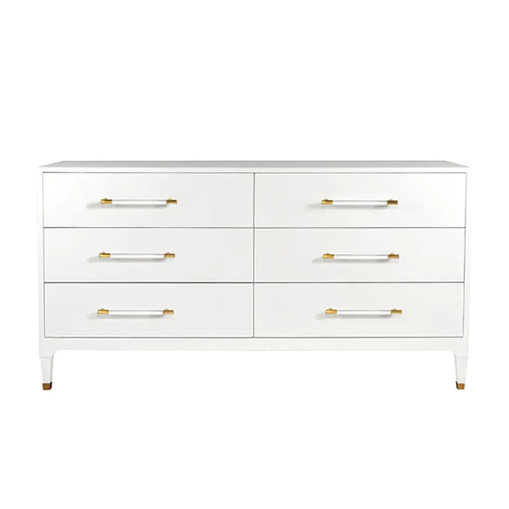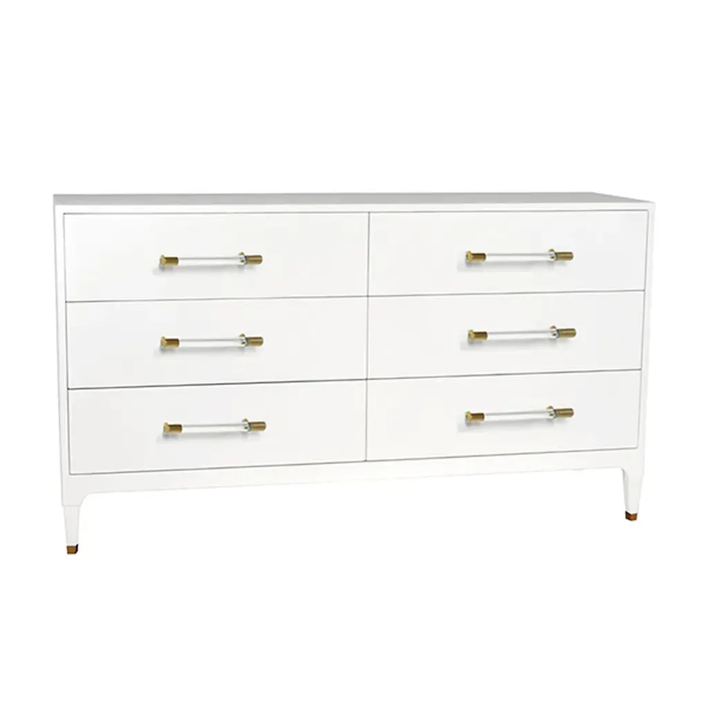 The six drawer Maren chest by Worlds Away is accented with acrylic and antique brass hardware pulls. Finished in your choice of luxurious dove grey shagreen or textured antique white linen, the Maren features lovely brass ferrule foot caps which complete the elegant look.