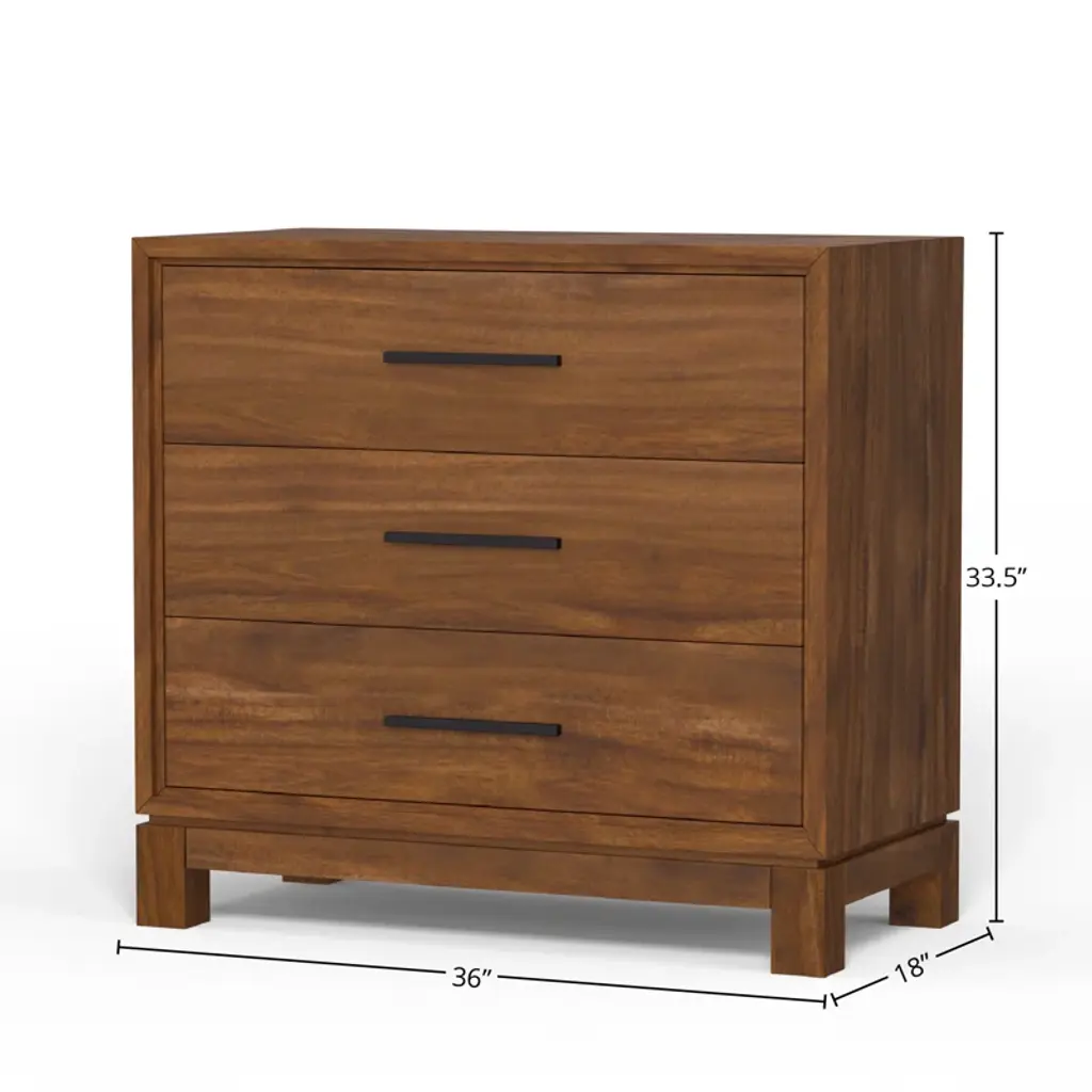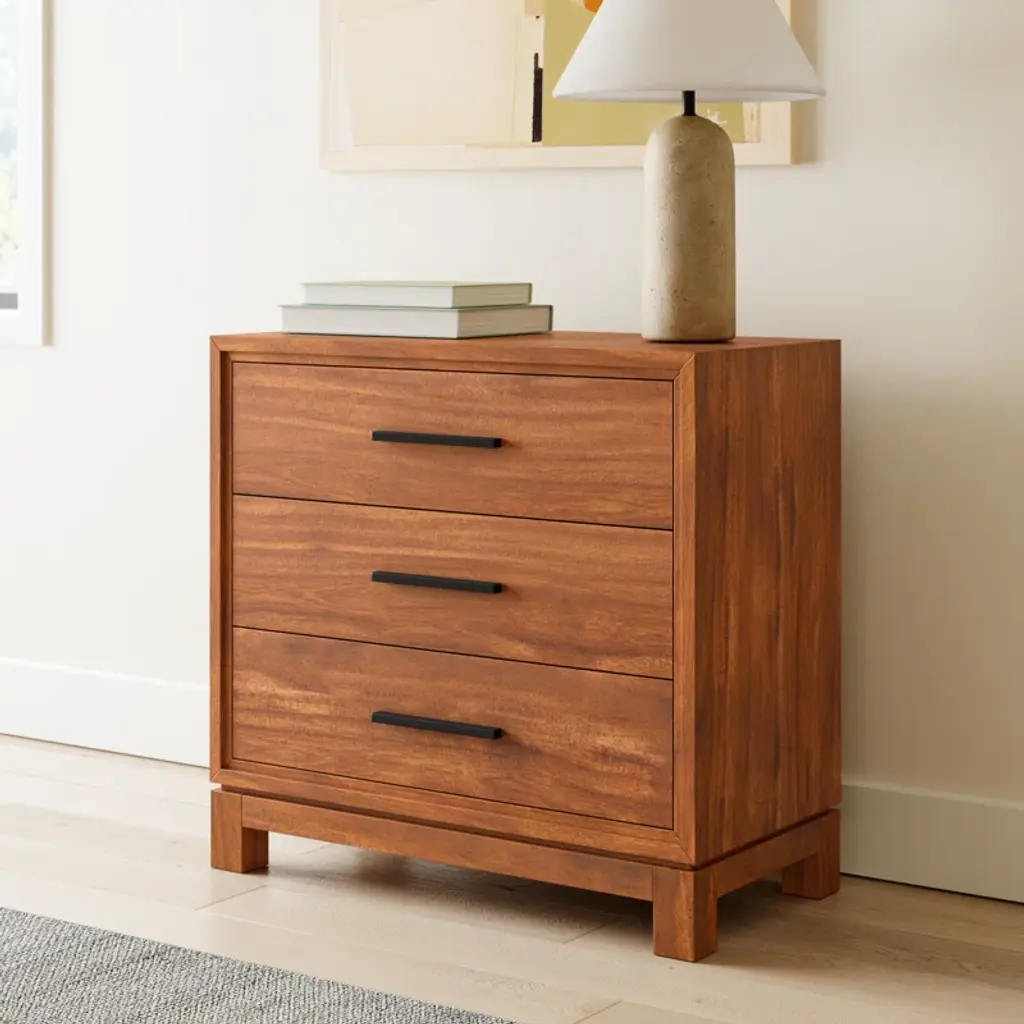 With its clean-lined design and matte black hardware, this 3-drawer dresser adds a fresh feel to any room. It's made from solid and engineered wood, and it sits on understated block legs. The dovetailed drawers sit on ball-bearing glides to provide smooth access to your cozy sweaters and classic tees. Plus, some of the drawers are felt-lined, so they're ideal for protecting your delicate items, and a wall anchor is included for extra stability.
