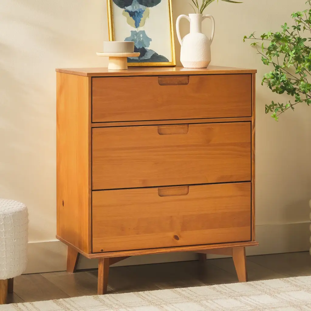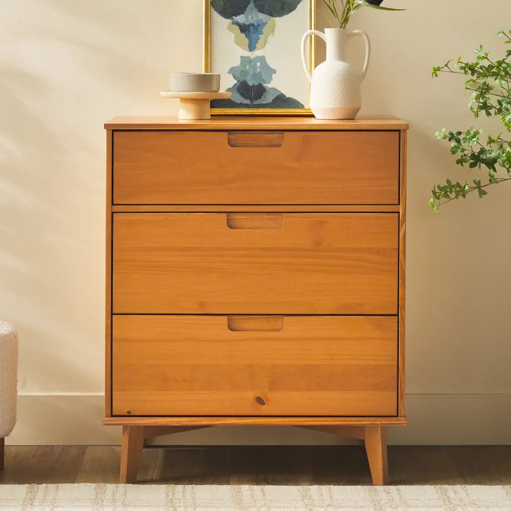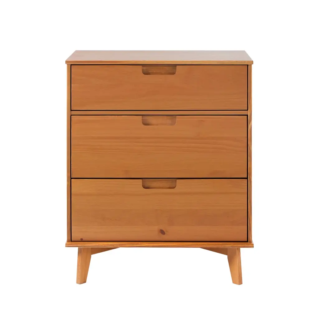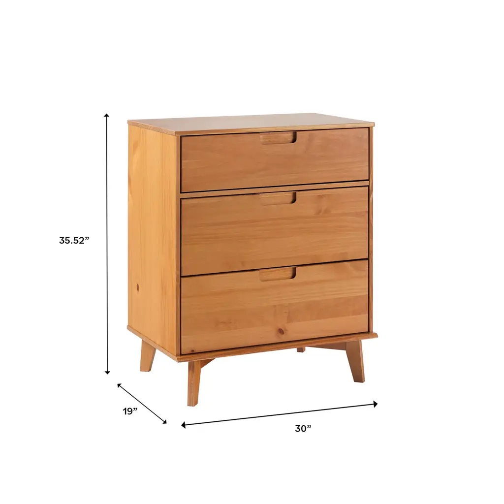 About This Product Sustainable, stylish, and storage savvy, this solid wood dresser is just what your bedroom needs. Three drawers on smooth wood runners offer all the closed storage your wardrobe needs, while its finish will complement any other bedroom furniture. The dresser is made from solid pine wood. Whether it’s housing your workout clothes and PJs in the bedroom, or everyday essentials in the living room, this storage chest will look right at home anywhere, whether your style is modern, boho, or coastal. Features With a stylish mid-century modern and transitional design Can be used as a dresser for your bedroom or a storage console for a guest room. Three storage drawers: With wall anchor and hardware to attach to the wall. Mid-century modern dresser 3 drawers on wood runners Block angled legs Wall anchor and hardware for anti-tip safety