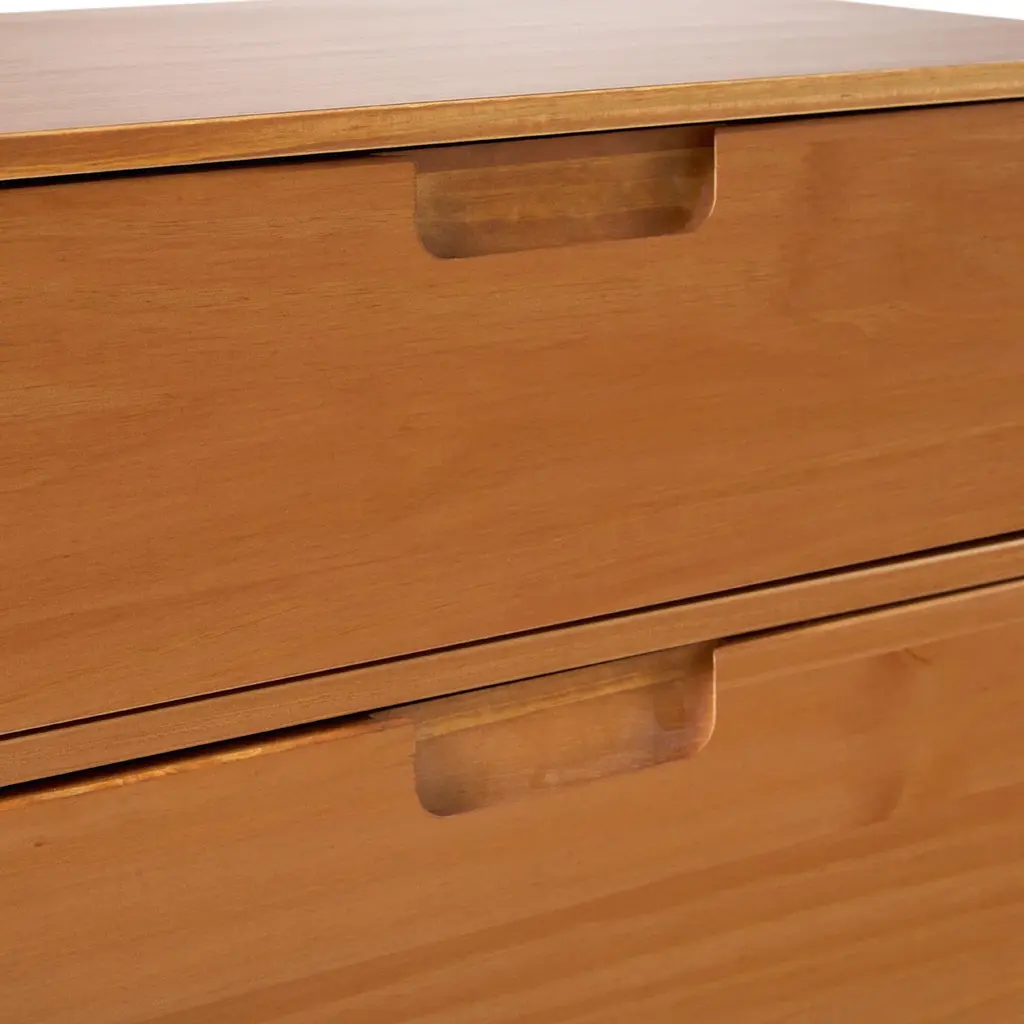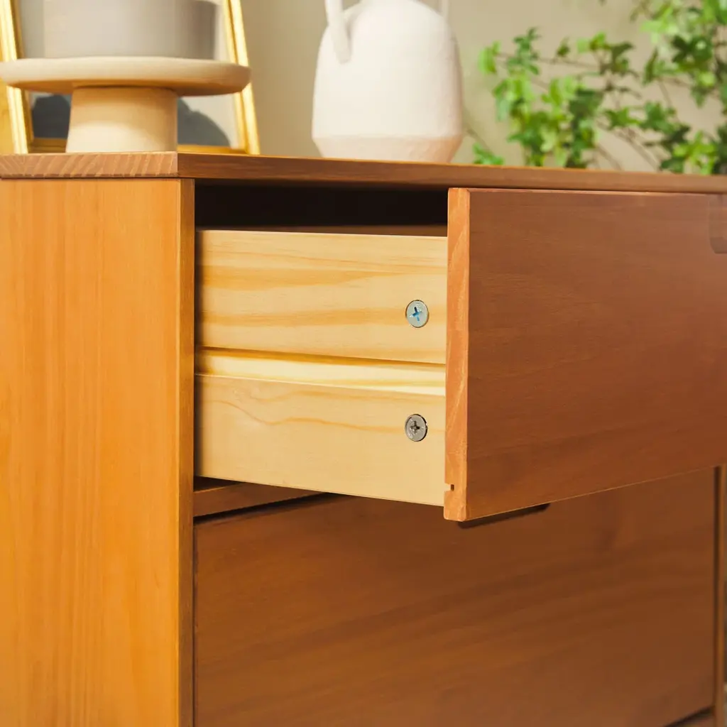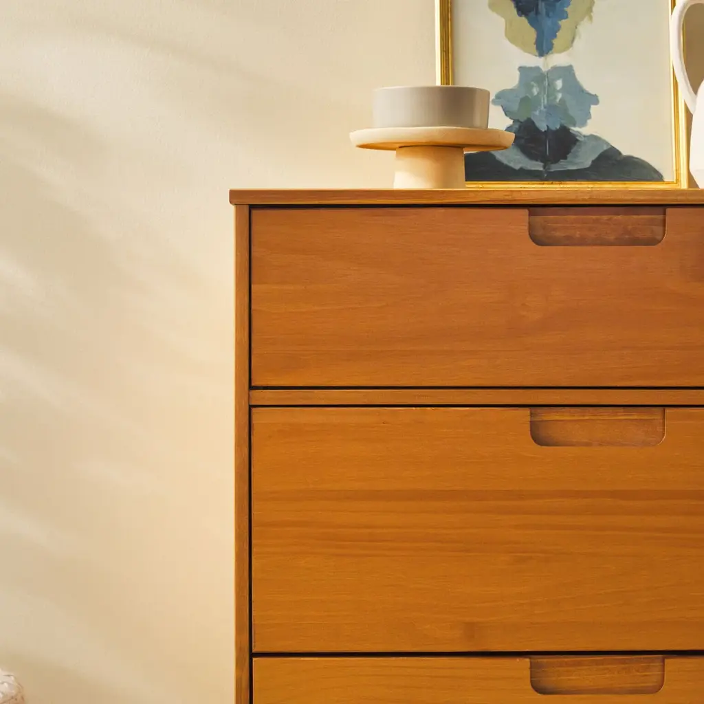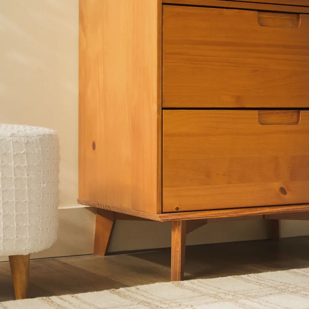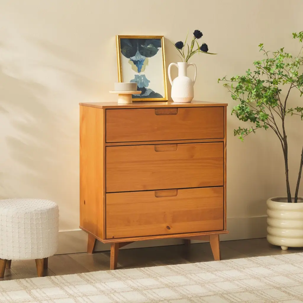 About This Product Sustainable, stylish, and storage savvy, this solid wood dresser is just what your bedroom needs. Three drawers on smooth wood runners offer all the closed storage your wardrobe needs, while its finish will complement any other bedroom furniture. The dresser is made from solid pine wood. Whether it’s housing your workout clothes and PJs in the bedroom, or everyday essentials in the living room, this storage chest will look right at home anywhere, whether your style is modern, boho, or coastal. Features With a stylish mid-century modern and transitional design Can be used as a dresser for your bedroom or a storage console for a guest room. Three storage drawers: With wall anchor and hardware to attach to the wall. Mid-century modern dresser 3 drawers on wood runners Block angled legs Wall anchor and hardware for anti-tip safety