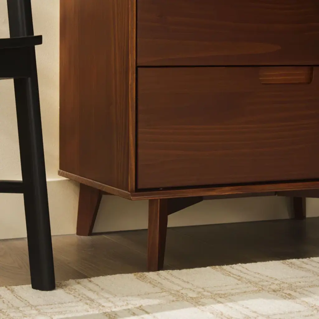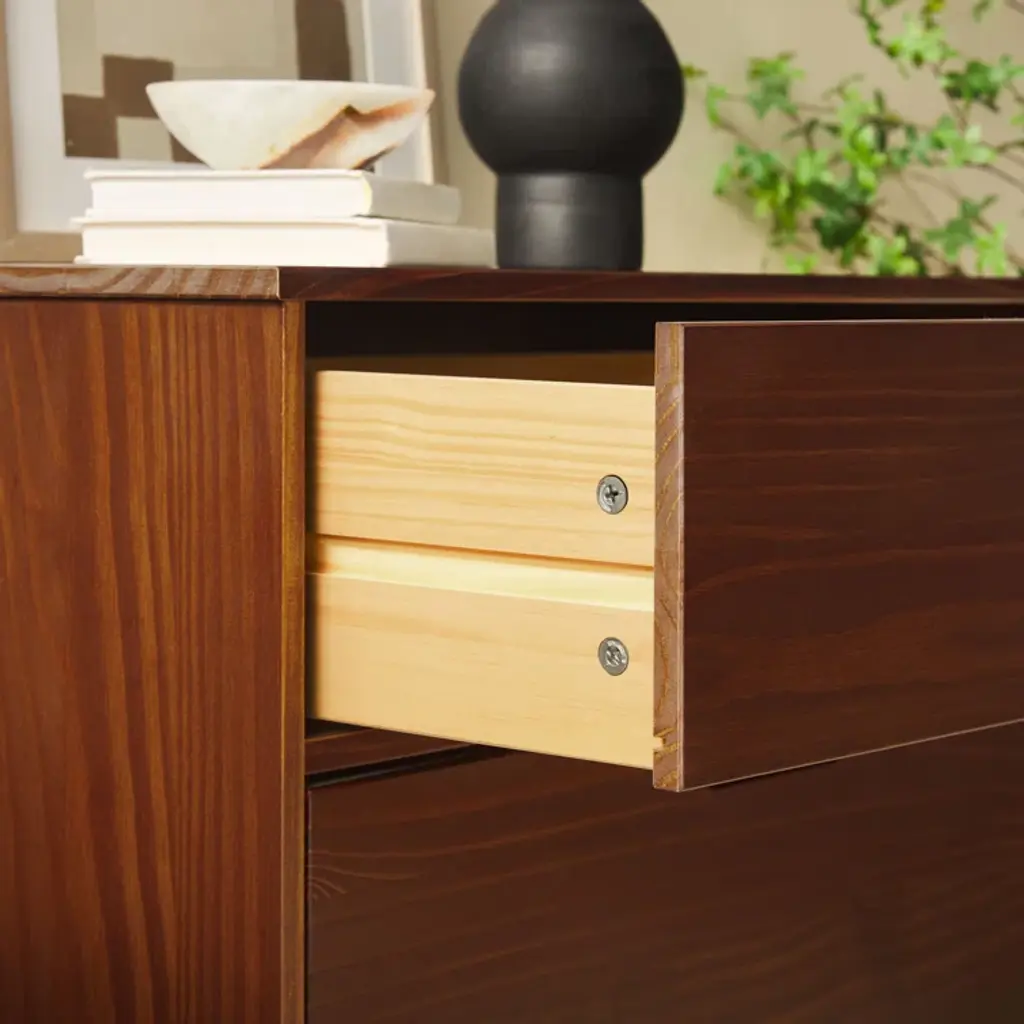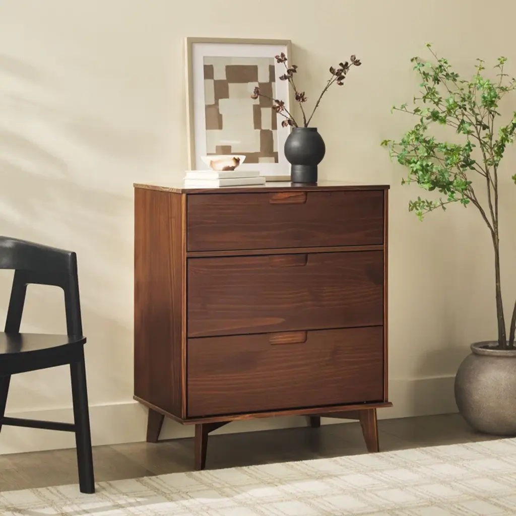 Sustainable, stylish, and storage savvy, this solid wood dresser is just what your bedroom needs. Three drawers on smooth wood runners offer all the closed storage your wardrobe needs, while its finish will complement any other bedroom furniture. The dresser is made from solid pine wood. Whether it’s housing your workout clothes and PJs in the bedroom, or everyday essentials in the living room, this storage chest will look right at home anywhere, whether your style is modern, boho, or coastal.