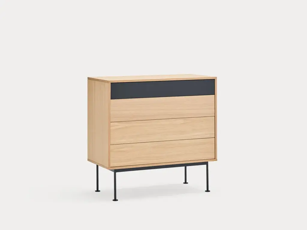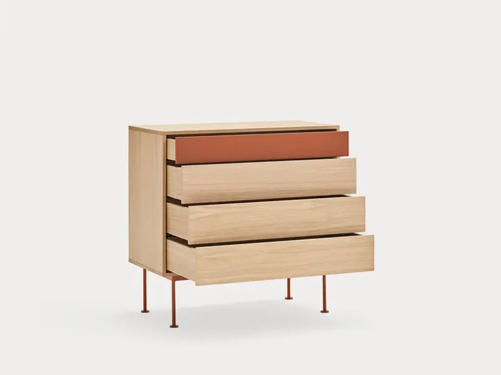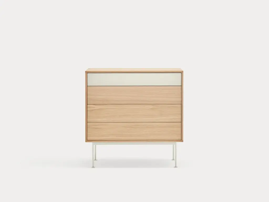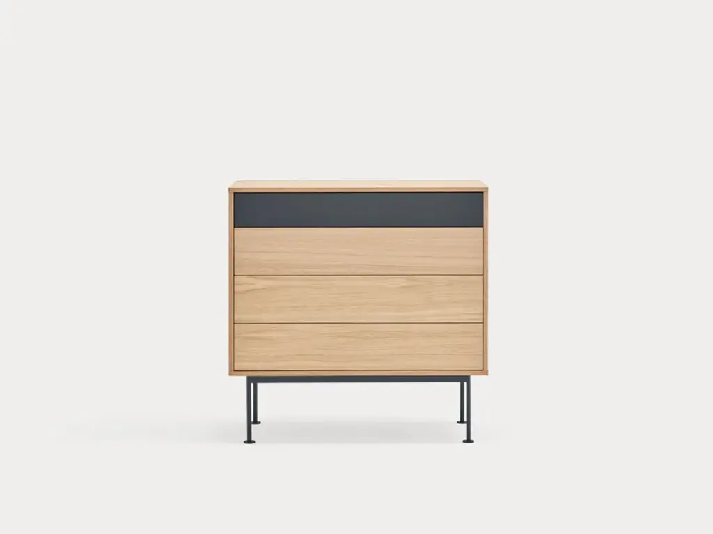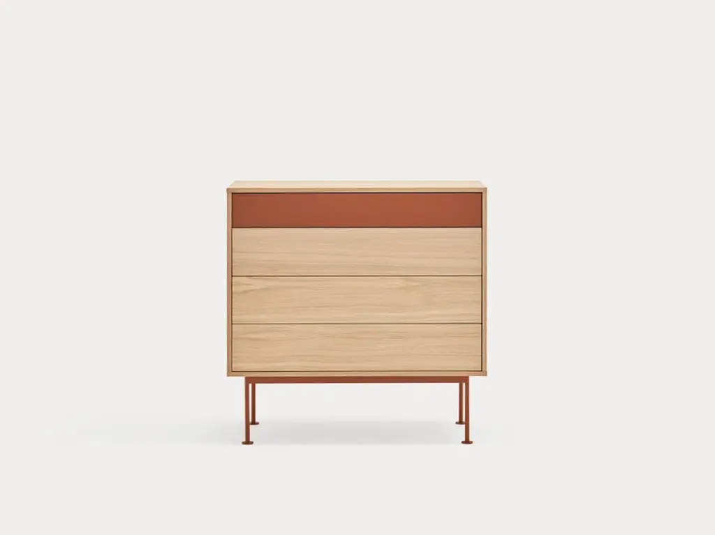 Yoko is an oak veneer chest of drawers except for some fronts, which are lacquered MDF. The legs are metallic and lacquered with the same colour as the fronts.Yoko is a collection that aims, through its simplicity and versatility, to offer a modern furnishing solution suited to the needs of contemporary homes.Completely veneered in oak, Yoko combines the natural beauty of wood with color accents, making it perfect to fit into different environments.