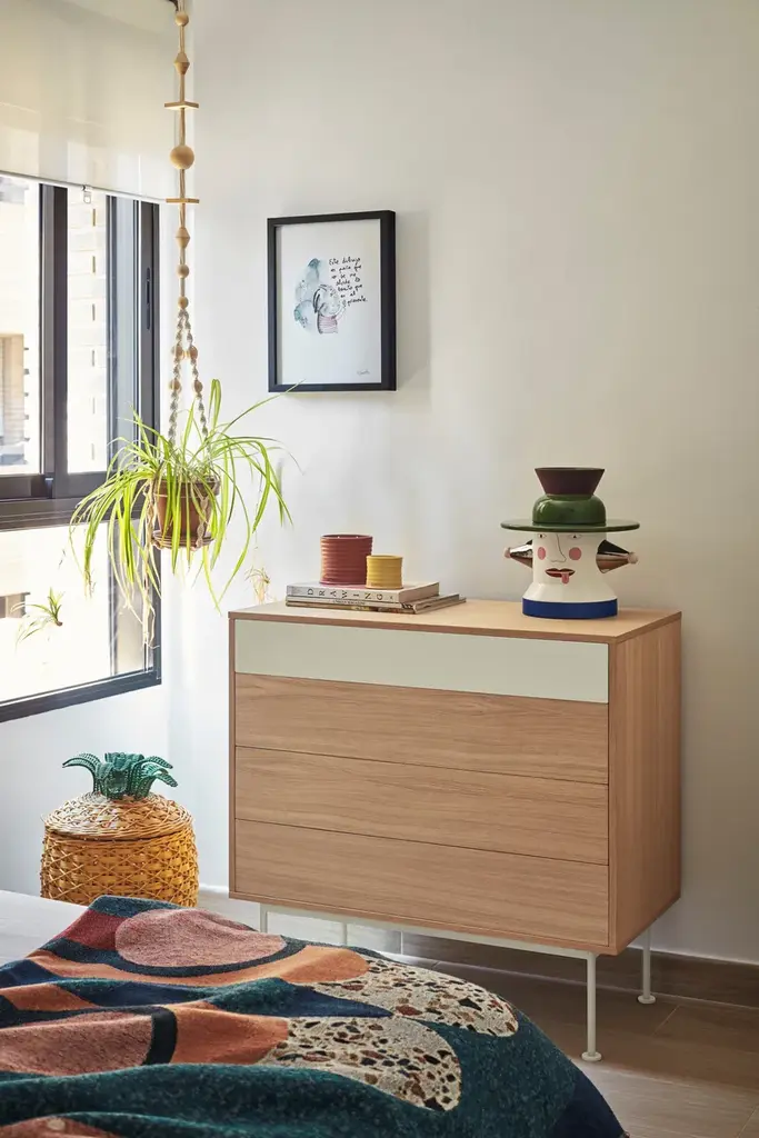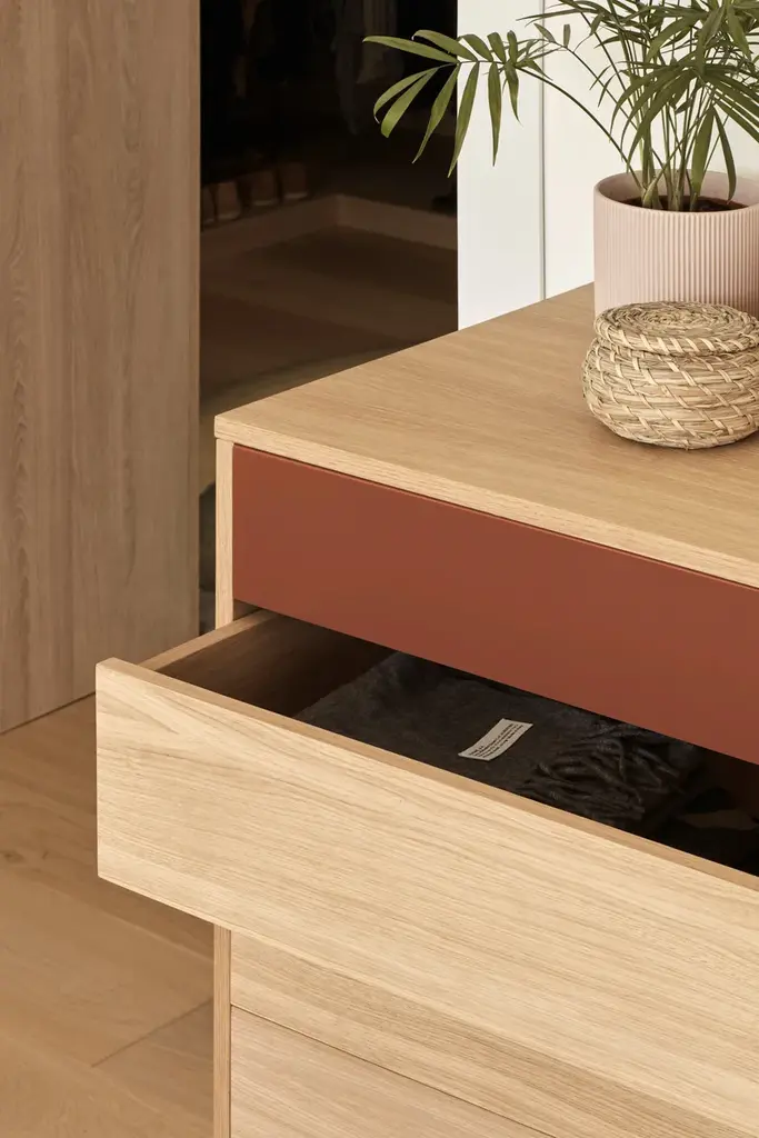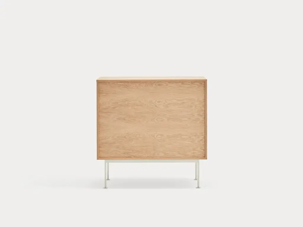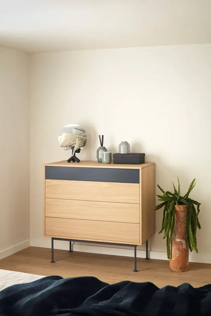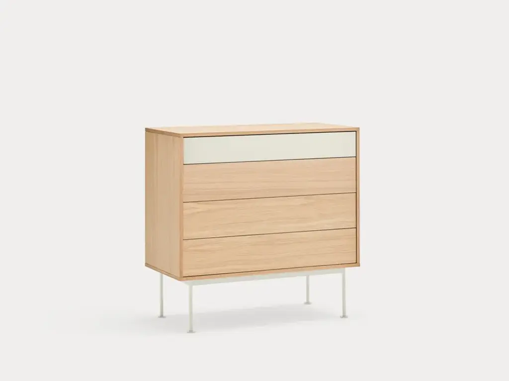 Yoko is an oak veneer chest of drawers except for some fronts, which are lacquered MDF. The legs are metallic and lacquered with the same colour as the fronts.Yoko is a collection that aims, through its simplicity and versatility, to offer a modern furnishing solution suited to the needs of contemporary homes.Completely veneered in oak, Yoko combines the natural beauty of wood with color accents, making it perfect to fit into different environments.