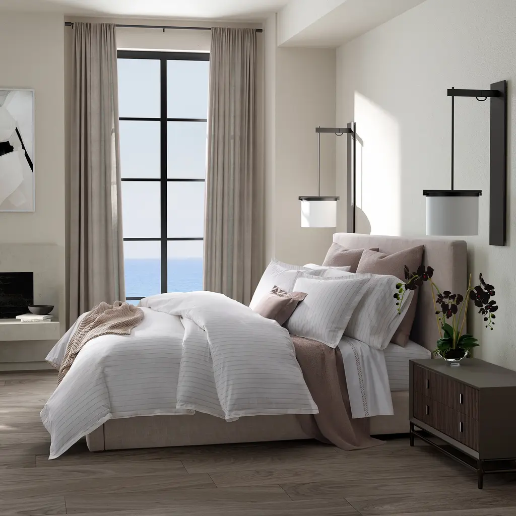 This ultra-soft bedding by Matouk features a crisp pinstripe design crafted from long-staple cotton percale for a refined, enduring quality. The Amalfi collection is versatile enough for effortless mix-and-match styling.