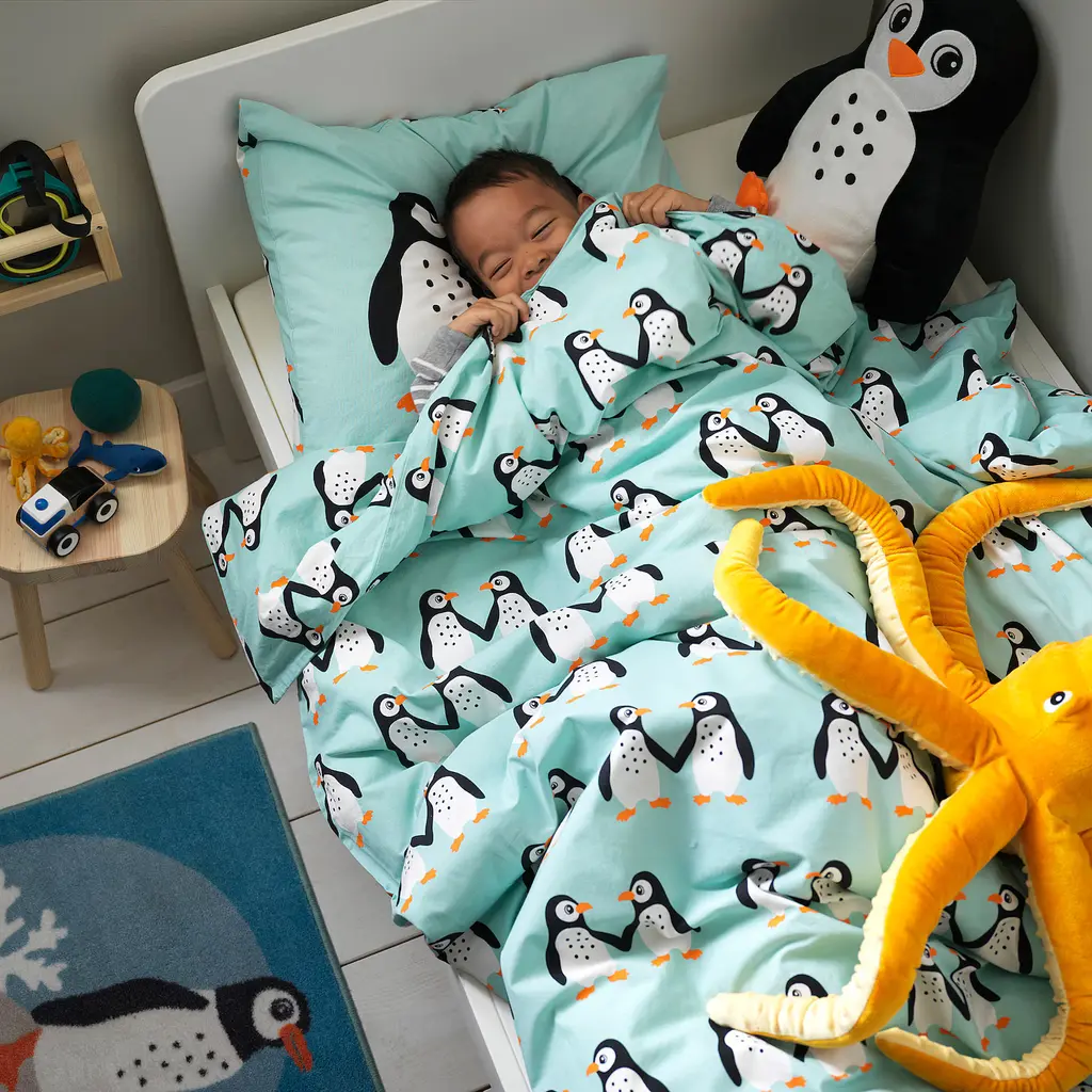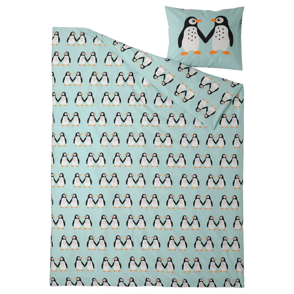 BLÅVINGAD Duvet cover and pillowcase(s) - penguin pattern/light turquoise Twin. Your child sleeps well all night since the cotton/viscose mix absorbs and transports moisture away, which helps the body maintain a comfortable and even temperature. The zipper keeps the duvet in place. 152 thread count.