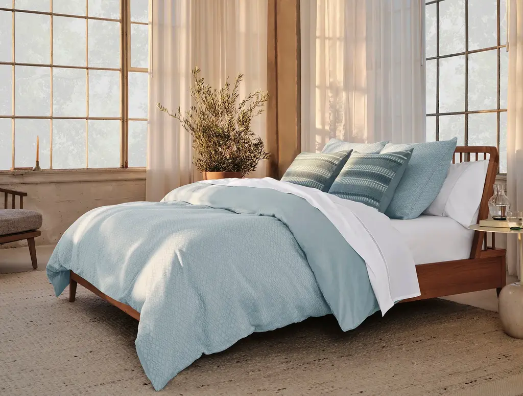 An exquisite diamond pattern brings luxurious texture to our Capitola Organic Duvet Cover, crafted with a tactile, dimensional weave. Its matte, soft feel offers year-round comfort, while 100% certified organic cotton promotes better sleep quality, night after night. Layer with a spectrum of nature-inspired hues to bring out the design’s beautiful highs and lows.