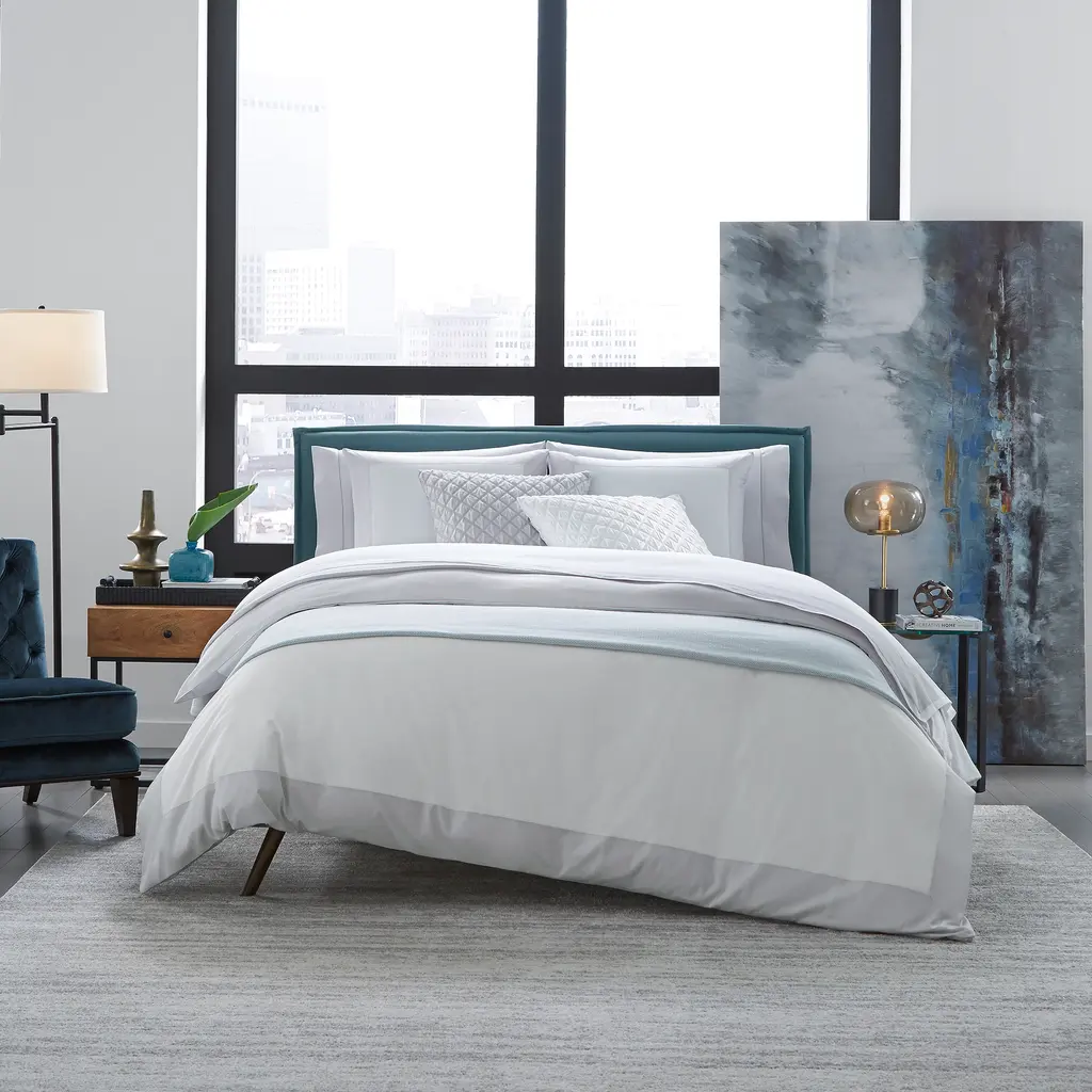SFERRA's Casida bedding collection is minimal and modern, creating an impact with its contrast color border in sateen applique along one side, and solid sateen on the reverse for multiple ways to style.
