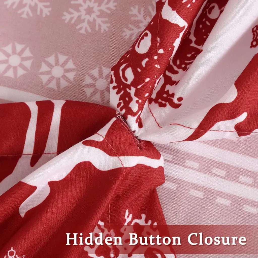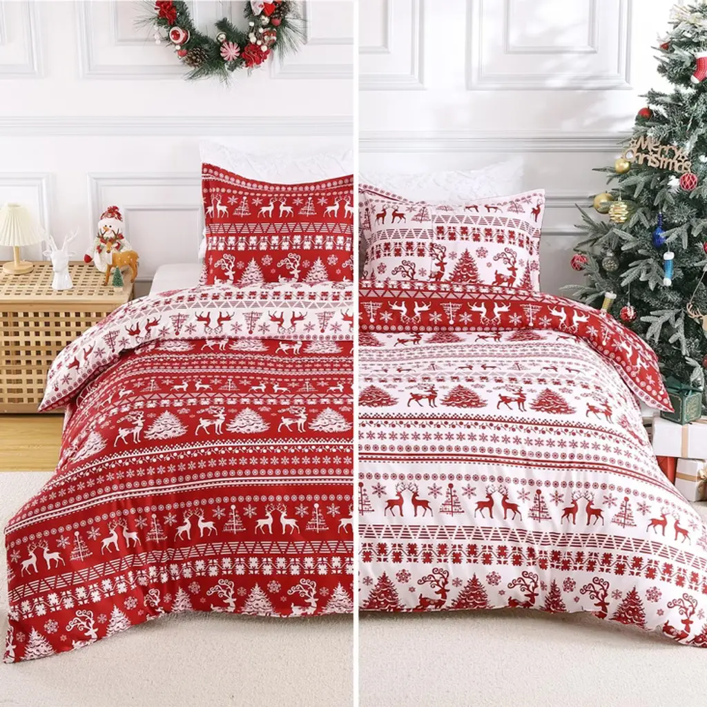 Bring festive cheer to your bedroom with this Christmas duvet cover set, featuring a reversible design with reindeer and Christmas tree patterns. Crafted from ultra-soft, skin-friendly material, this bedding set ensures cozy comfort and easy care—just machine wash and tumble dry. Secure corner ties and a button closure keep your comforter in place, while matching envelope pillow shams complete the look. It's the perfect way to add holiday warmth to your home or give as a thoughtful Christmas gift.