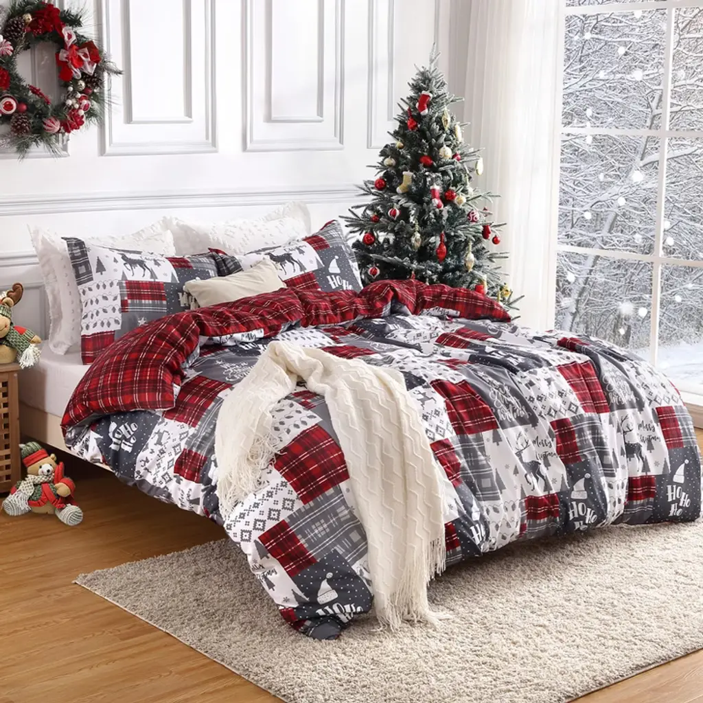 Product DescriptionThis Christmas duvet set is crafted from brushed fabric for a soft and comfortable night's sleep. This bedding set will brighten your home and add a touch of warmth to the cold Christmas season.Product informationSize: Queen / KingMaterial: PolyesterColor: Christmas GreyPattern: FloralNumber of Pieces: 3Style: ChristmasIncluded Components: Duvet Cover, Pillow ShamThread Count: 300Product Care Instructions: Machine WashTheme: HolidaySeasons: WinterItem dimensions L x W x H: 90 x 90 x 0.99 inches / 104 x 90 x 0.99 inchesPillowcase Quantity: 2Unit Count: 3.0 CountProduct Dimensions: 90 x 90 x 0.99 inches / 104 x 90 x 0.99 inchesItem Weight: 2.79 pounds / 3.27 pounds