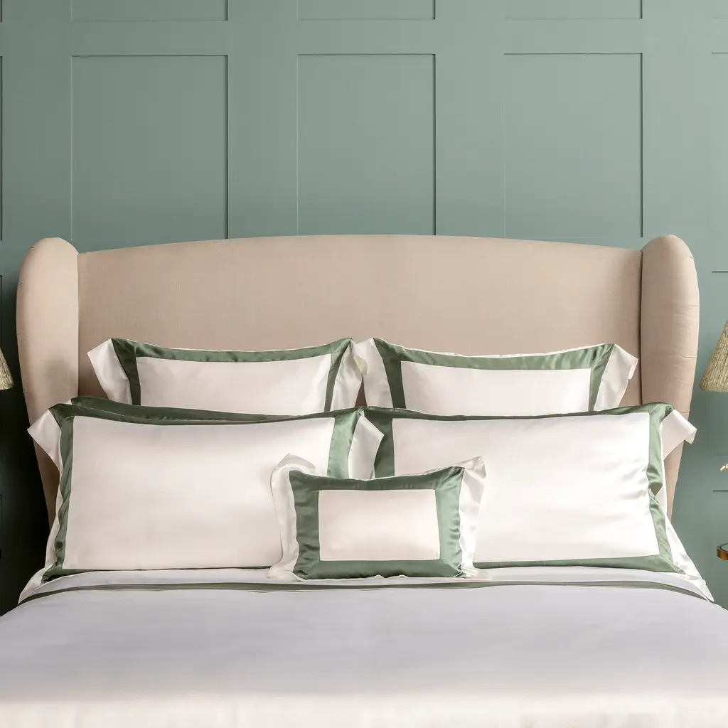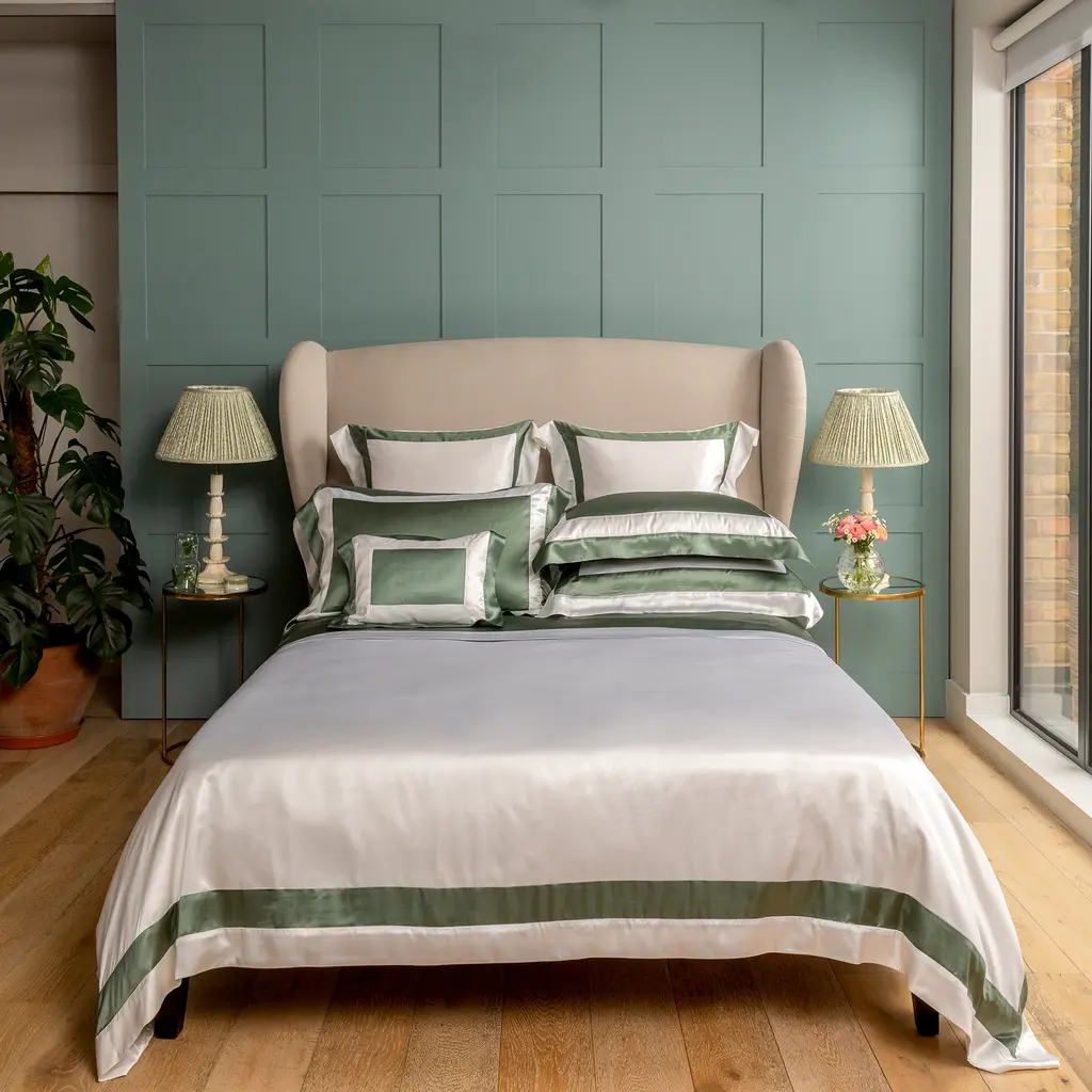 The Ashdown and Ebury collections are designed to bring a sense of tranquillity whilst offering a versatile approach to styling. Named after the treasured, idyllic Ashdown Forest in East Sussex the Ashdown collection of luxurious silk bedding, made from the finest pure mulberry silk, is offered in an enchanting deep green that carries the beauty and benefits of nature into the bedroom. This soothing and gentle green is combined with a fresh and pretty white border to create a timeless and elegant collection. Pairing beautifully with Ashdown, the Ebury collection, named after London's elegant and historic Ebury Street, features captivating white silk bedlinen with a green border. Here the green becomes a beautiful decorative detail framing the luxurious expanse of pure white silk.
