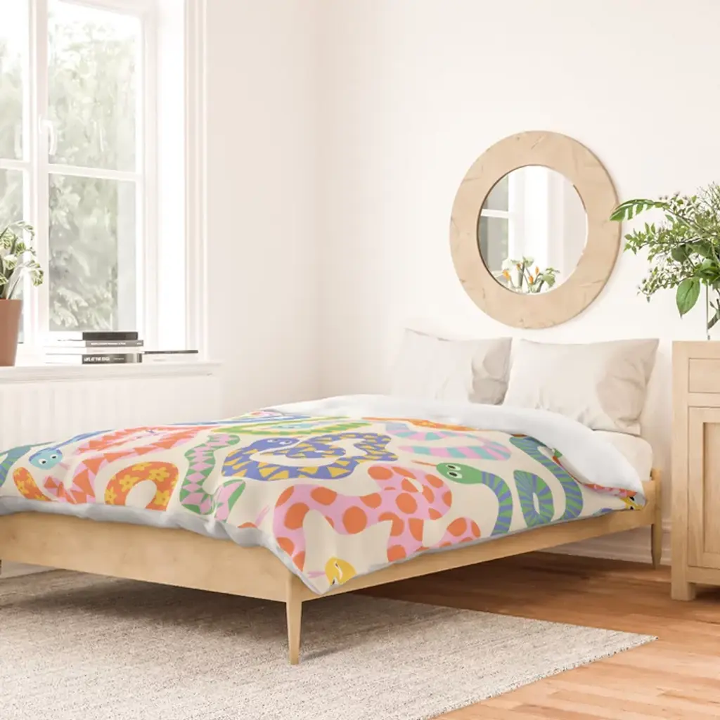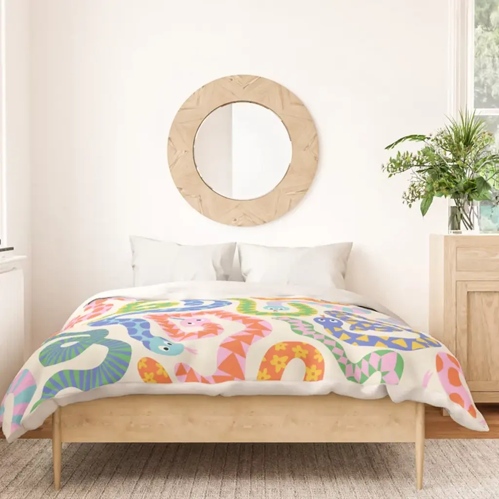 Happy Snakes Light - Bright Rainbow Textured Snakes With Funky Geometric Patterns On Cream Duvet Cover