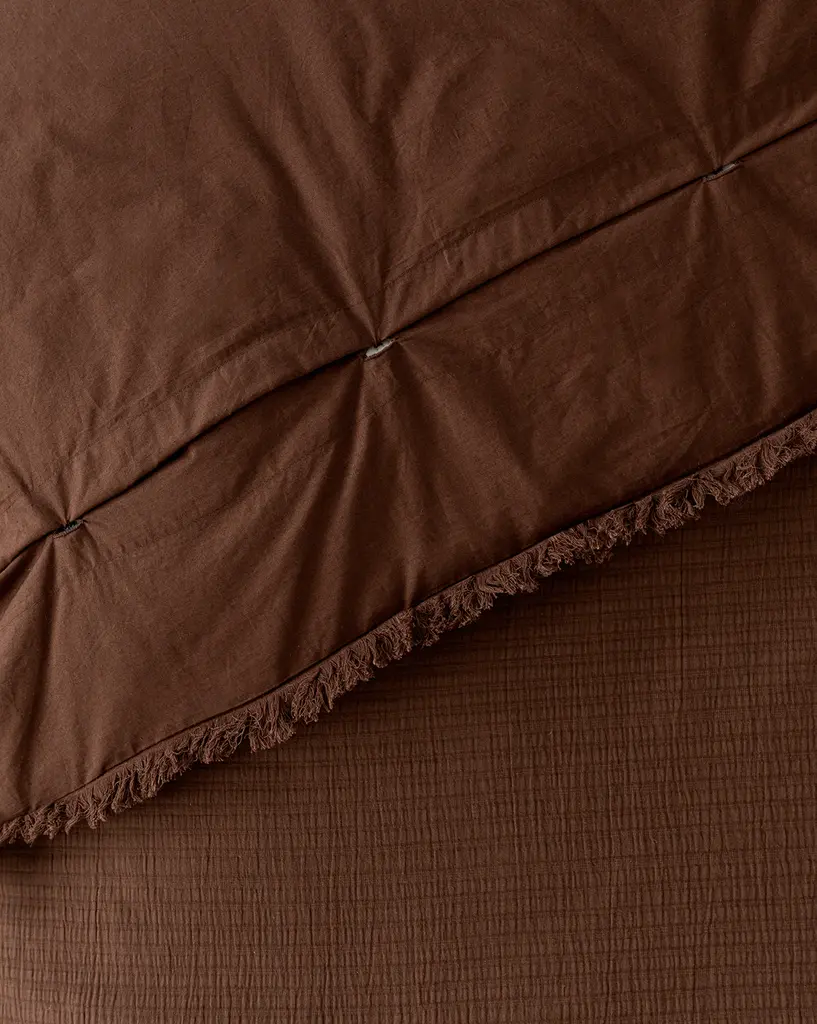 With subtle fringe on the border and a rich brown hue, our Hendricks Chocolate Cotton Duvet Cover brings a relaxed yet elevated look to your bedding. Made from 100% cotton, the textural feel of the duvet lends detail and comfort to bedroom styling.