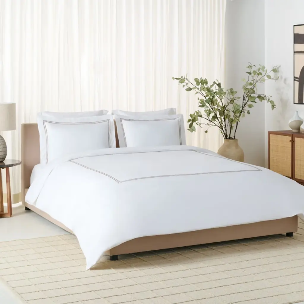 Introducing the Hotel Collection 2-Line Embroidered Duvet Cover Set, a refined blend of elegance and comfort for your bedroom sanctuary. Crafted from 100% cotton with a crisp 300-thread count percale shell, this luxurious bedding set delivers both softness and sophistication. The duvet cover features a clean white base, beautifully accented with tasteful two-line embroidery in a shimmery golden taupe, adding a luminous touch of timeless charm to any decor. This versatile set is available in two convenient sizes: Full/Queen and King/Cal King. The duvet cover is thoughtfully designed with internal corner ties and a hidden zipper closure to ensure a secure and polished fit. Coordinating shams feature a two-inch flange around the edges and an envelope closure for a tailored, finished look. Neatly packaged in a clear PVC pouch for easy viewing and storage, this duvet cover set is a perfect marriage of function and style. Redefine your bedroom with the Hotel Collection, where understated elegance meets everyday comfort.